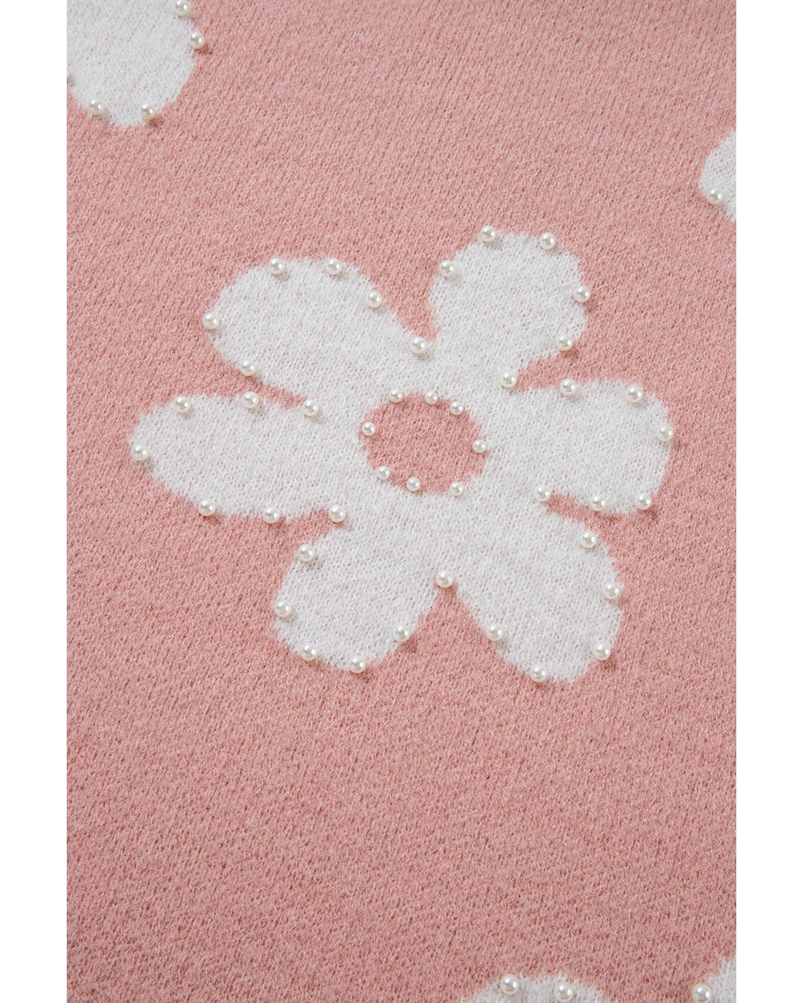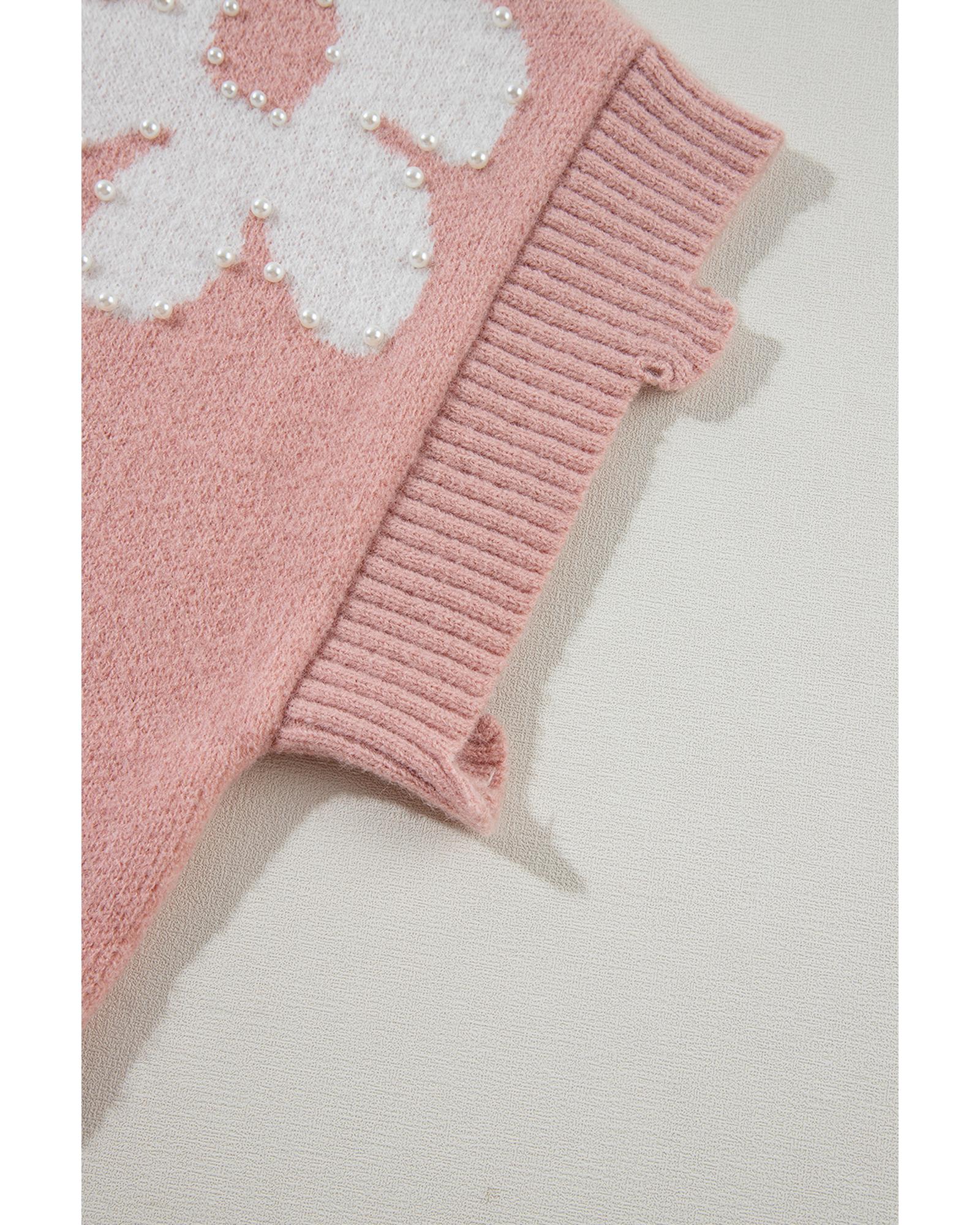 This light pink sweater T-shirt features a trendy fitted design with a relaxed fit for comfort. It is decorated with feminine pearled accents and a floral pattern, complemented by a unique distressed edge detail. Its versatile style makes it suitable for all seasons and easy to pair with various bottoms.
