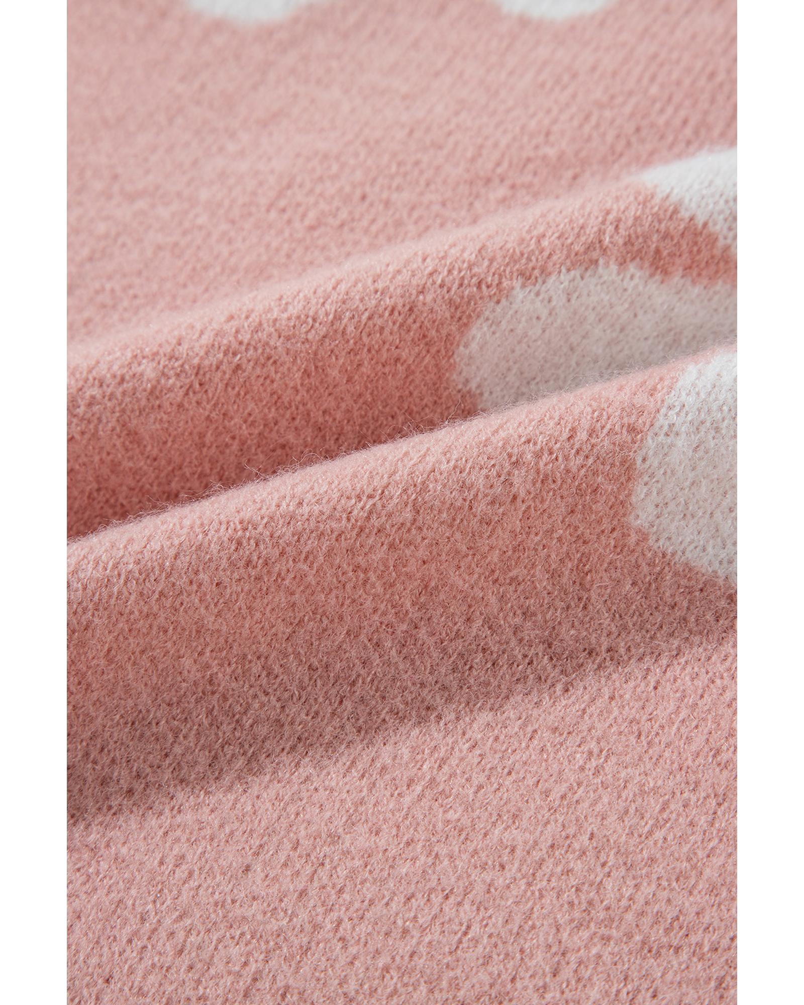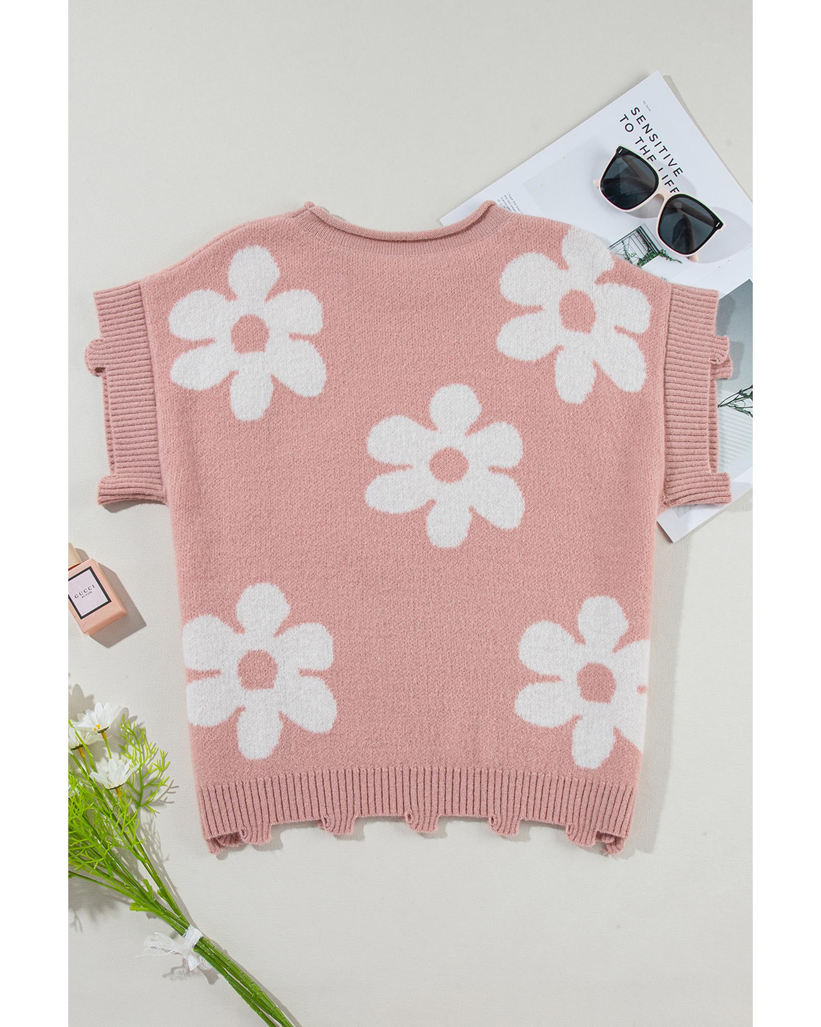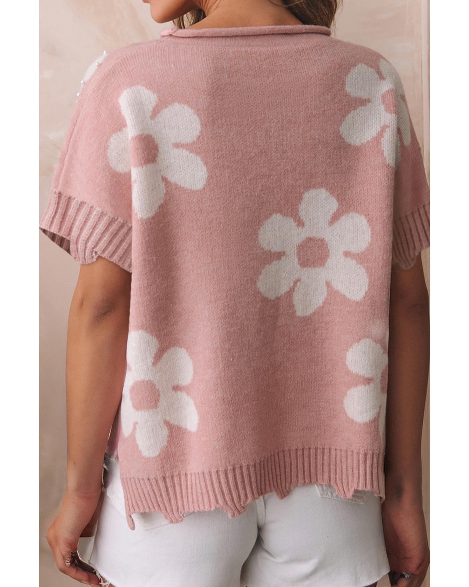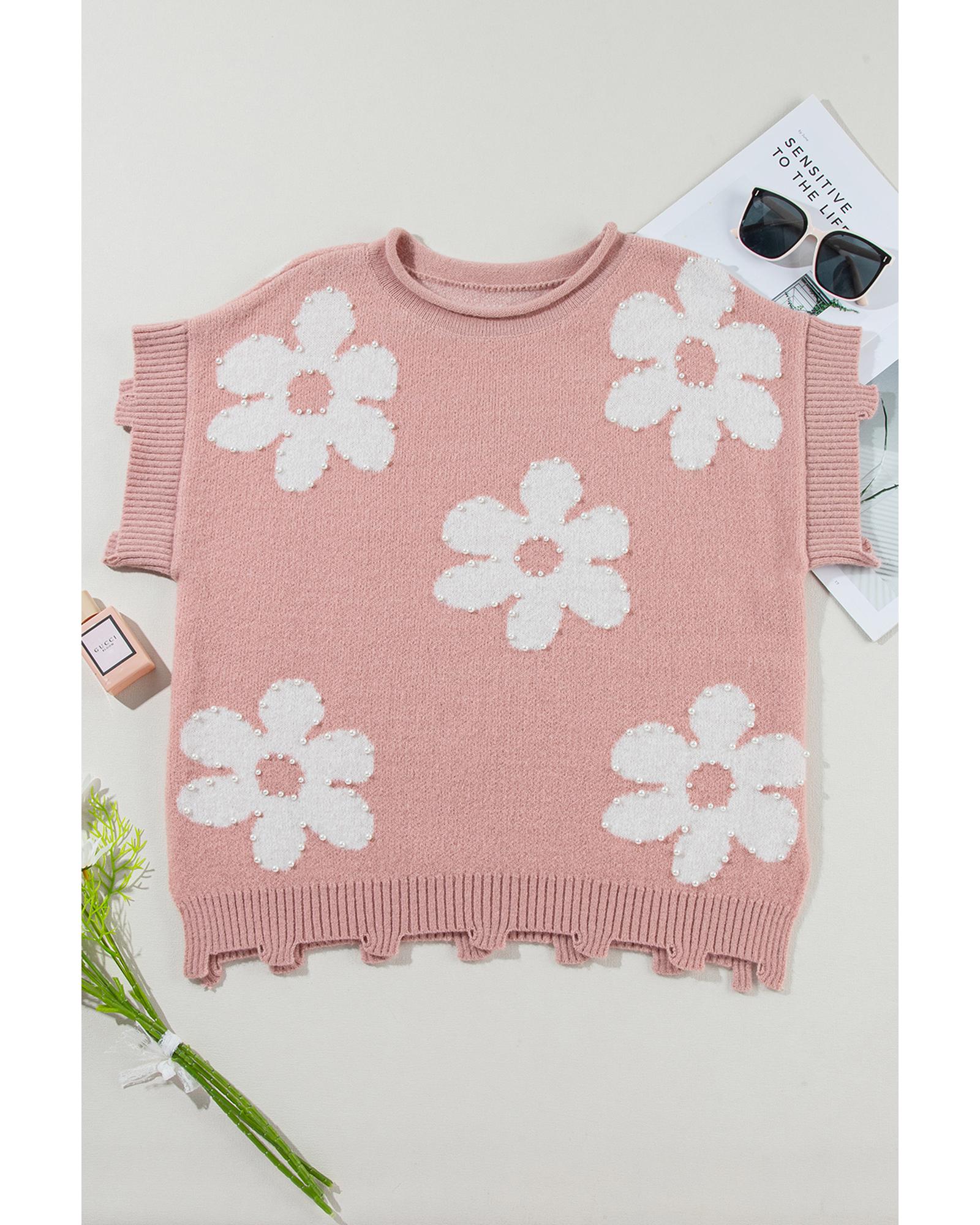 This light pink sweater T-shirt features a relaxed fit with a feminine design, including pearled decorations and floral patterns. The distressed edge detail adds a unique touch, making it versatile for various outfits and suitable for all seasons.