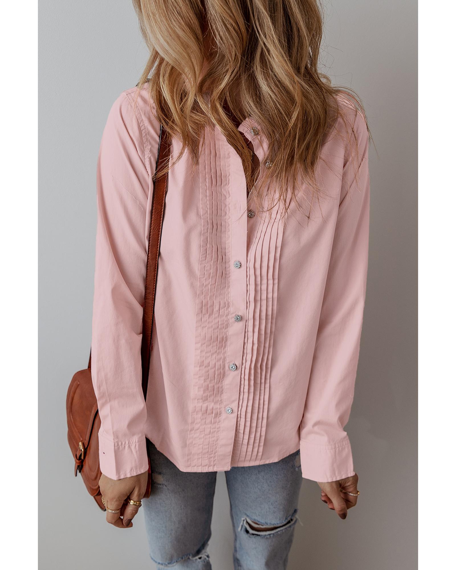 This light pink pleated button-up shirt offers a casual and versatile style with a loose fit suitable for most body types. Made from 100% cotton, it provides comfort for everyday wear, featuring pleated details and a traditional front button design for a classic look.