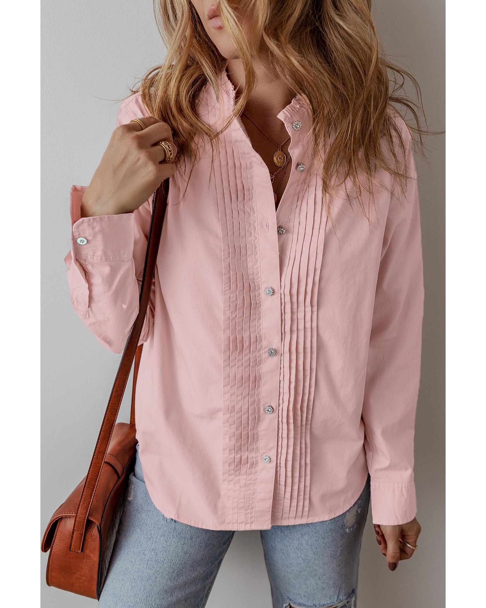 This light pink pleated button-up shirt offers a casual and versatile style with a loose fit suitable for most body types. Made from 100% cotton, it provides comfort for everyday wear, featuring pleated details and a traditional front button design for a classic look.