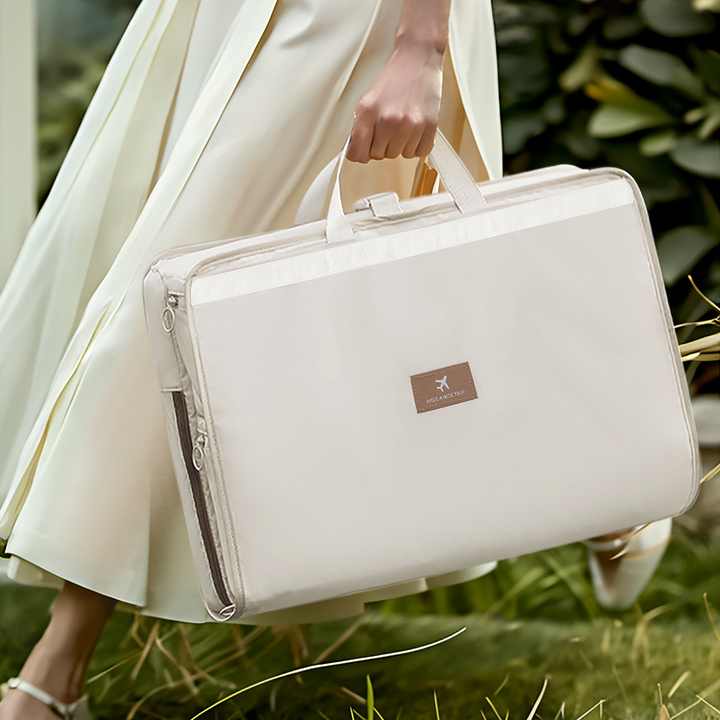 This light pink travel storage organizer bag is designed with multiple compartments to help you keep your clothes, underwear, and accessories neatly organized. Its lightweight and foldable design makes it a convenient packing solution for travel and business trips, offering easy access and efficient use of space.