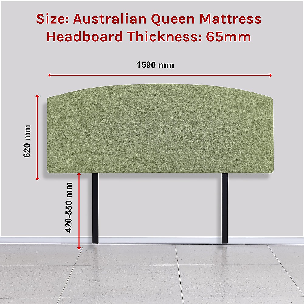 This linen fabric queen bed curved headboard in olive green offers a stylish and affordable way to enhance your bedroom decor. Designed to fit Australian standard queen-sized bed frames, it combines modern elegance with practical features, making it a versatile addition to any bedroom setting.