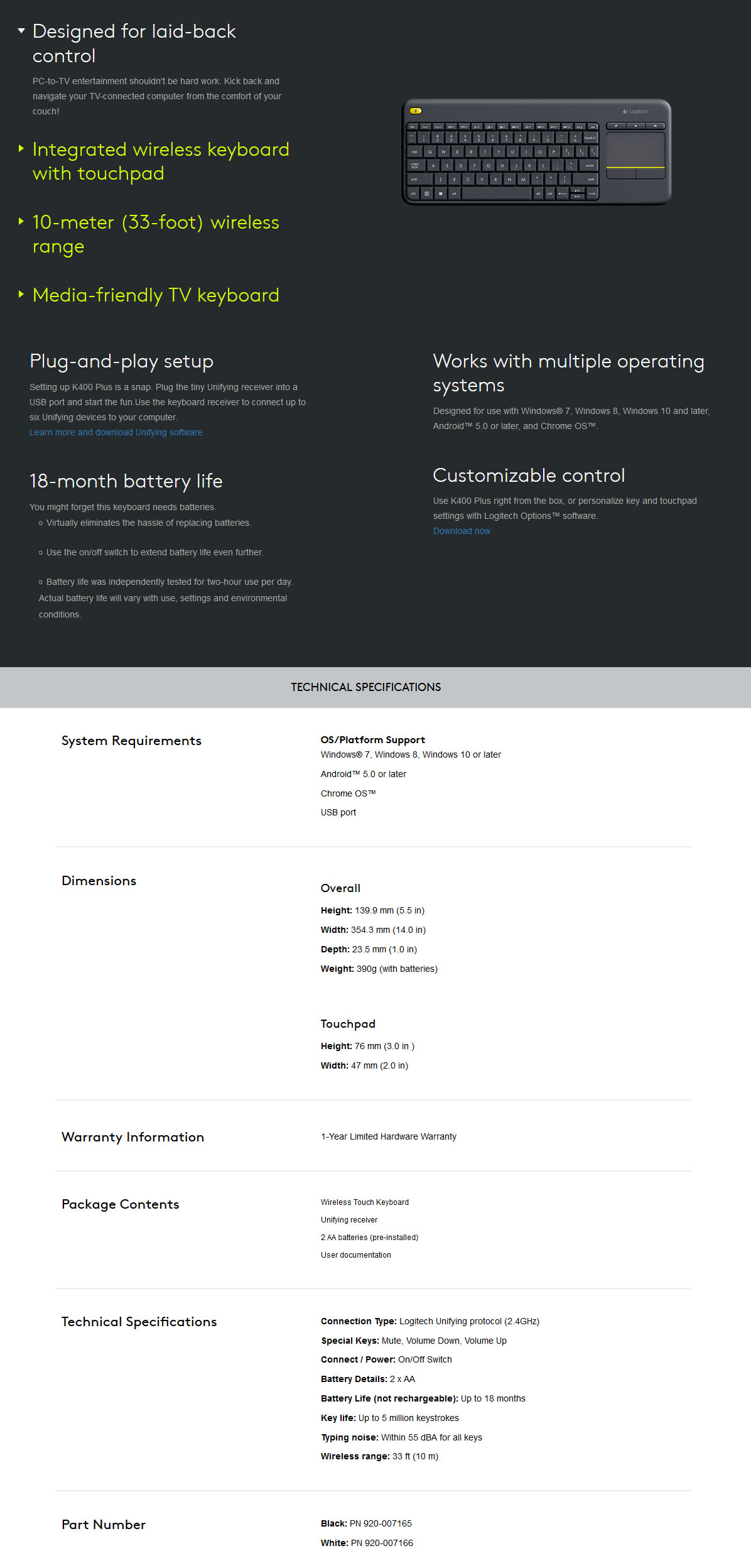Logitech K400 PLUS Touch Wireless keyboard – Black (920-007165)