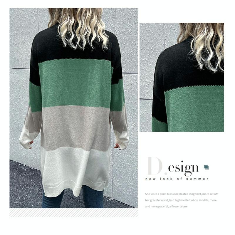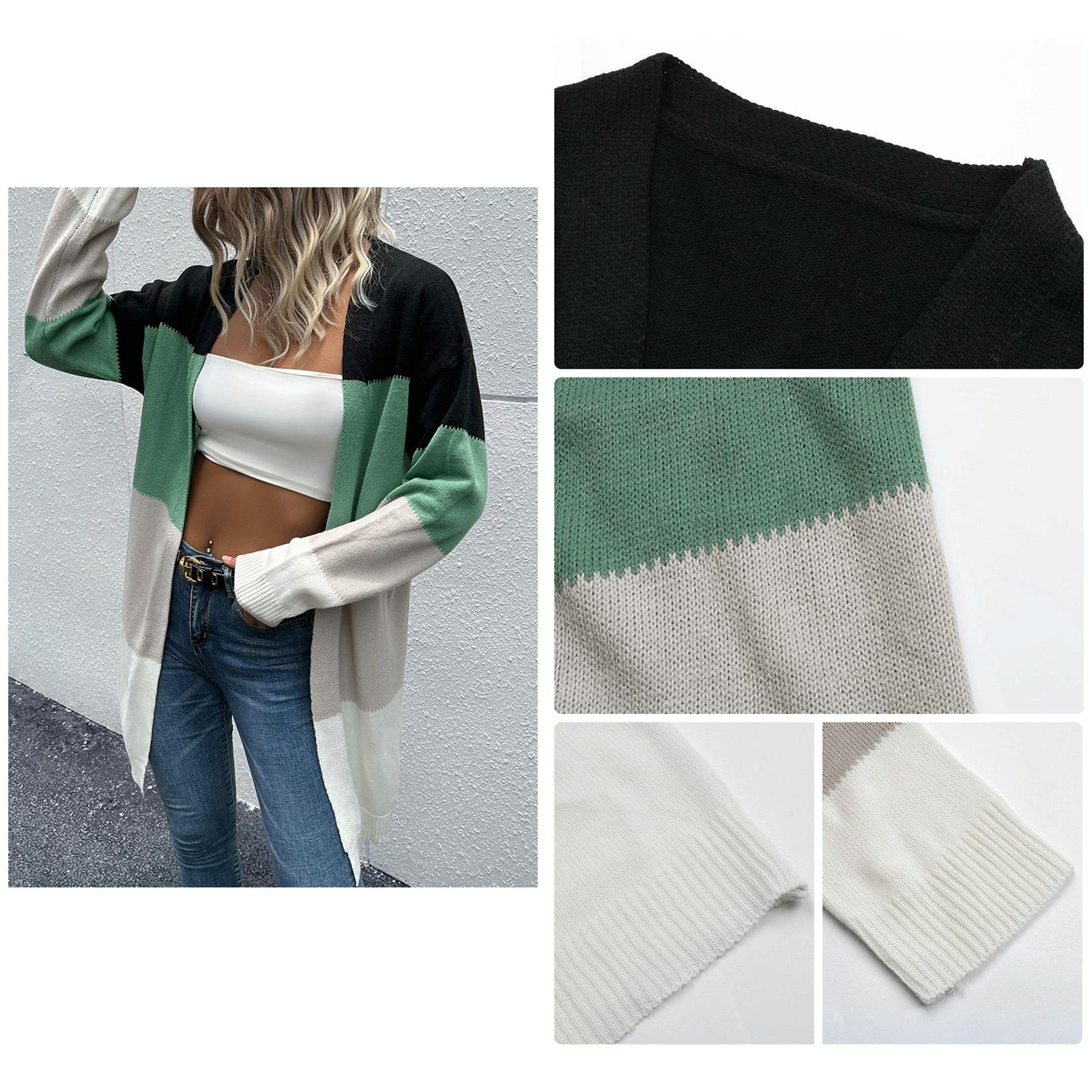 This long cardigan features an open front design with a color block pattern, making it a versatile and stylish addition to your wardrobe. Crafted from soft, lightweight knit material, it offers comfort and ease of wear for various seasons. The knee-length design with long sleeves makes it suitable for spring, autumn, and winter outfits.