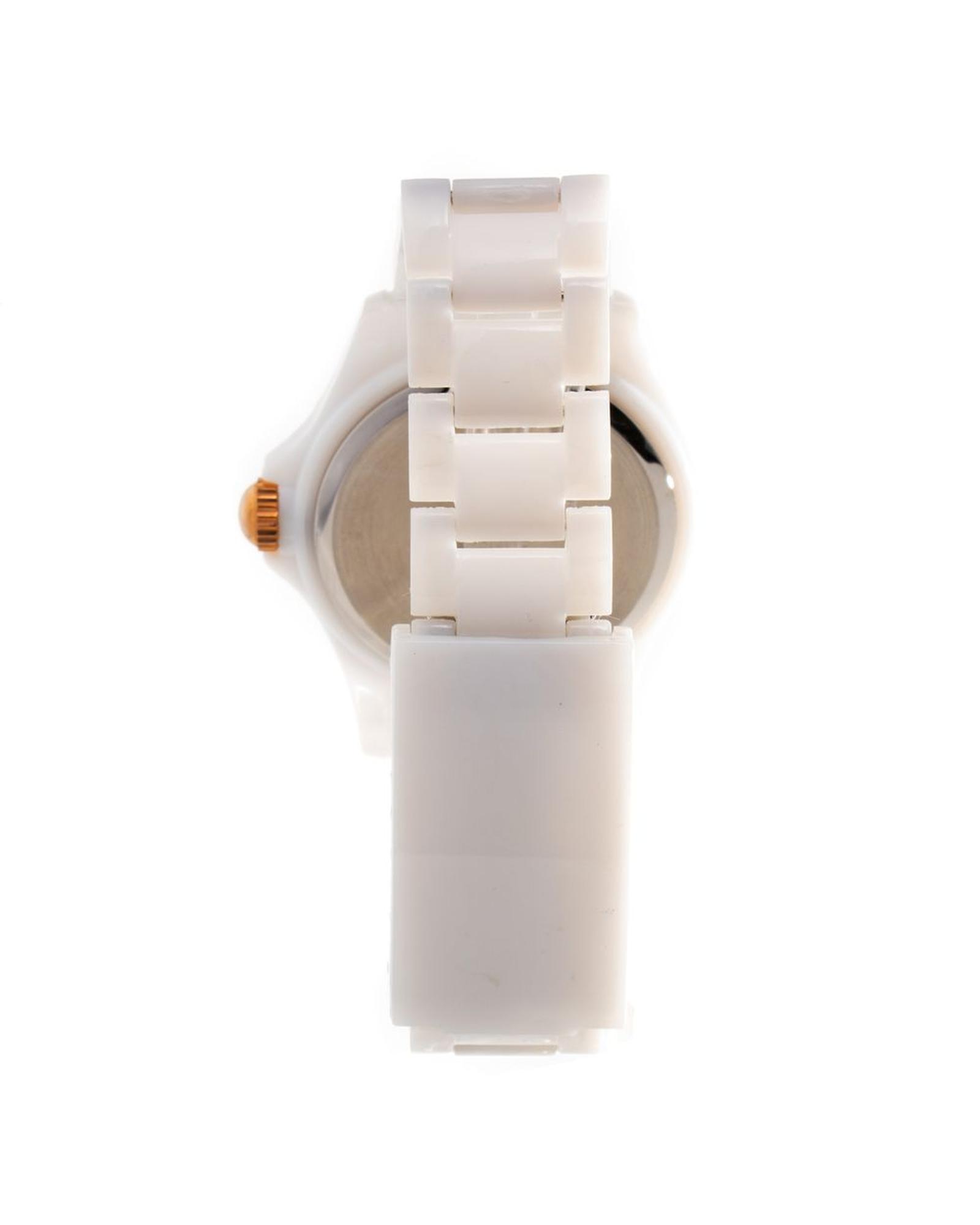 This women’s watch features a sleek white plastic design with an elegant analogue display. It combines a lightweight case and bracelet for comfortable wear, making it suitable for everyday use. The watch is powered by a reliable quartz mechanism and is finished with a durable mineral glass for added protection.