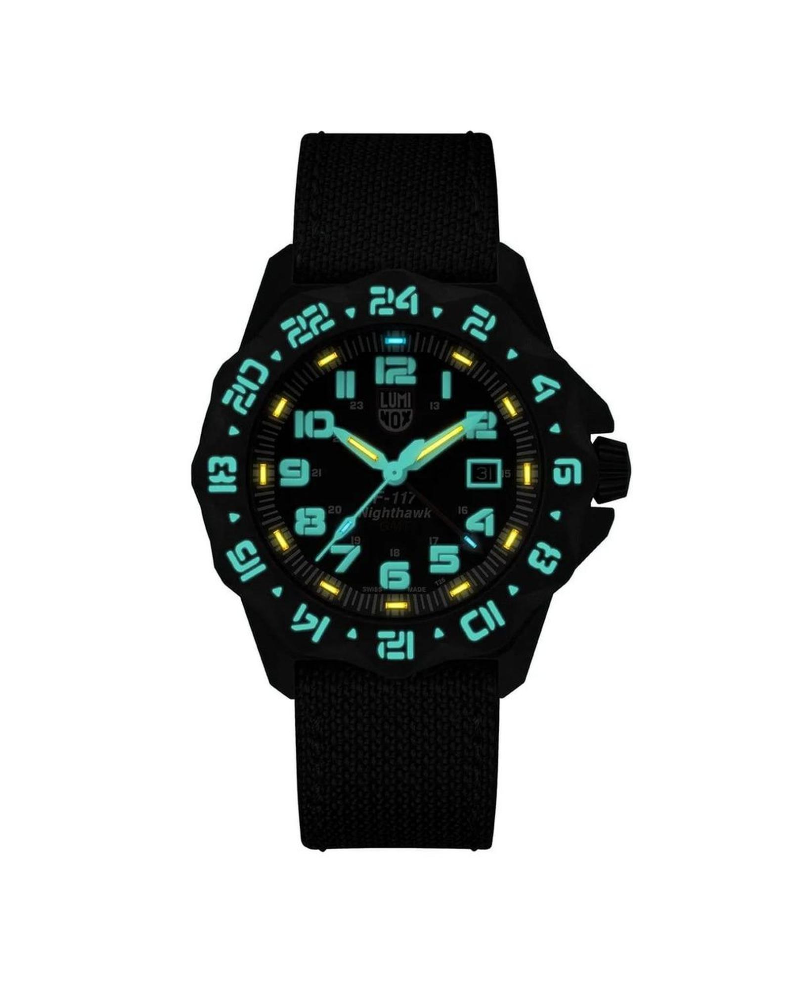 This men’s watch features a durable design with a carbon case and a fabric strap, offering a sleek black appearance. It combines reliable quartz movement with multiple functionalities, making it suitable for various occasions and environments.