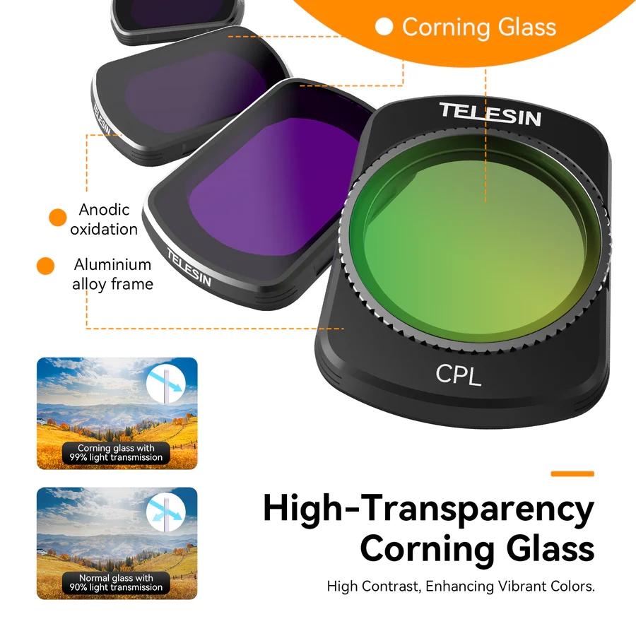 This magnetic suction filter set is designed for use with the DJI Pocket 3. It includes adjustable filters that enhance color saturation, picture clarity, and control over shooting effects. The set features a rotatable CPL filter and ND filters to reduce light entry and prevent overexposure. Its magnetic design allows for easy replacement, and the filters are coated to resist water droplets and stains. The lightweight construction ensures convenient handling and storage.