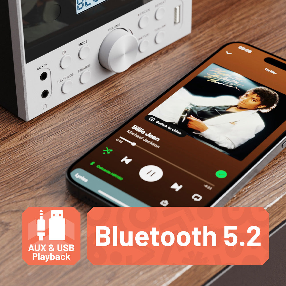 • Connectivity: Bluetooth 5.2, USB, AUX