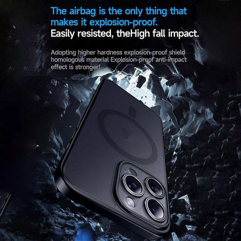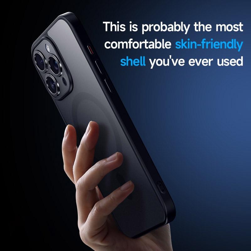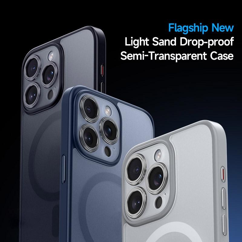 This matte magnetic case is designed for the iPhone 15, offering durable protection with a sleek titanium black finish. It combines a soft edge material with a sturdy outer shell to safeguard your device from scratches, dirt, and everyday wear. The case features a bionic lotus leaf oleophobic layer that resists fingerprints and oil stains, maintaining a clean appearance. Its precise cutouts allow easy access to all buttons and ports, and the magnetic design supports wireless charging for convenience.