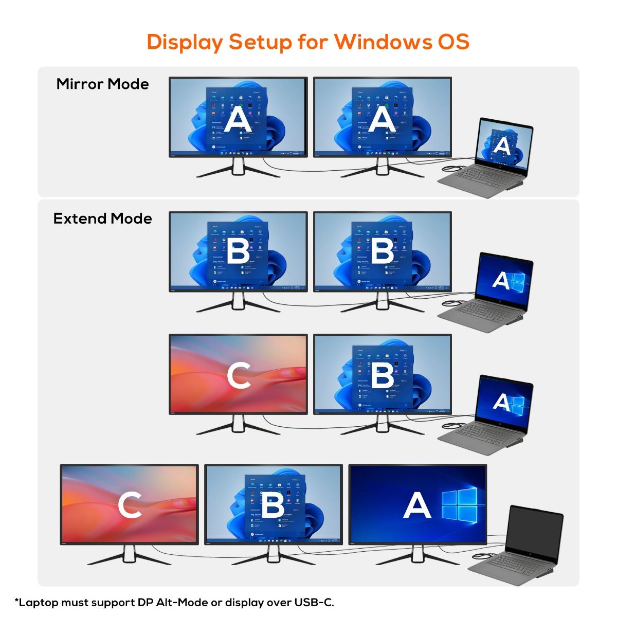 - Dual display options include HDMI + DisplayPort, HDMI + VGA, and DisplayPort + VGA, all supporting 4K/30Hz or 1080P/60Hz