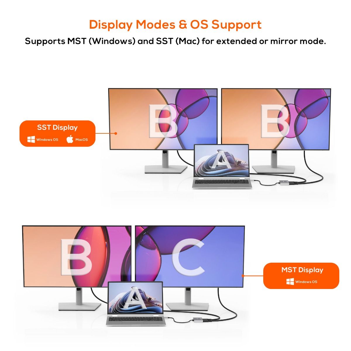 • Supports extended and mirror display modes, with MST on Windows and SST on macOS
