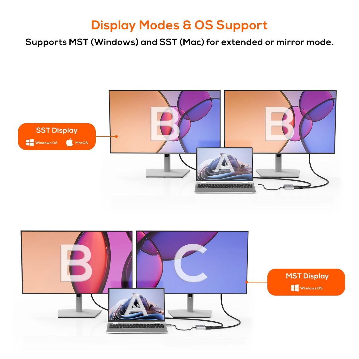 • Display Modes: Extended and mirror modes; Windows supports MST, macOS supports SST