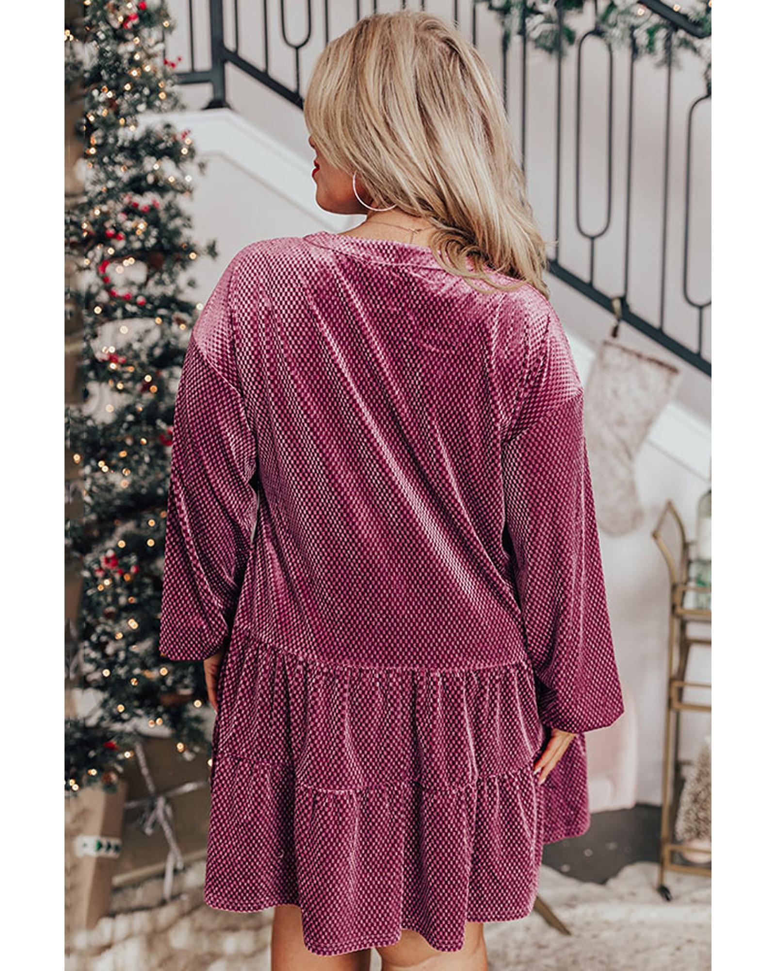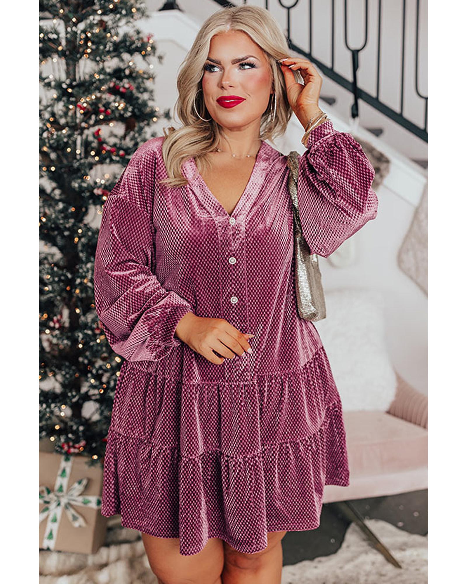 This plus size textured velvet tiered dress features a stylish design with a flattering fit, suitable for various occasions. The dress is crafted with a textured finish that enhances its visual appeal, complemented by a chic V-neckline with buttoned detailing. It offers a trendy, fitted silhouette that aligns with international sizing standards, making it a versatile addition to any wardrobe.