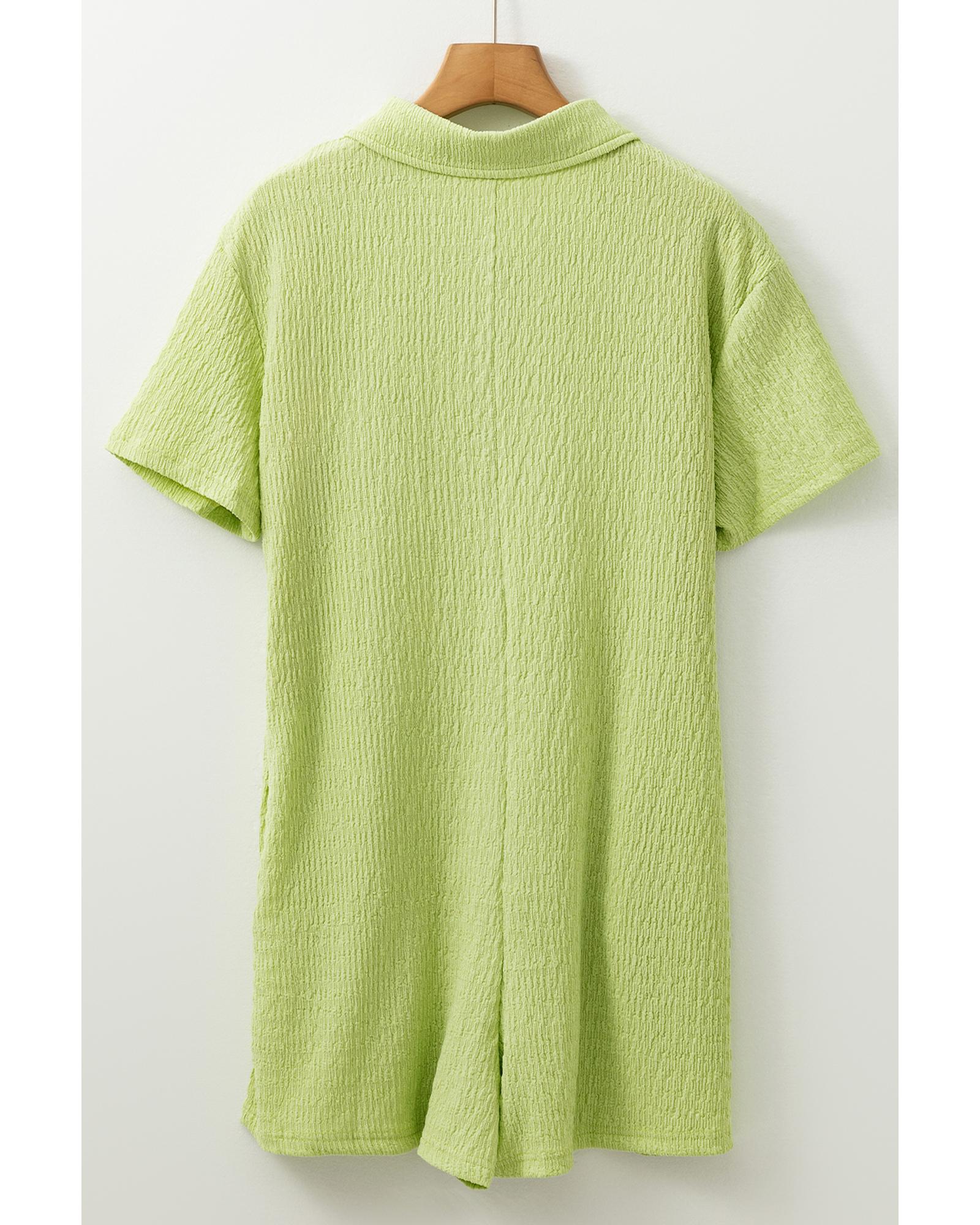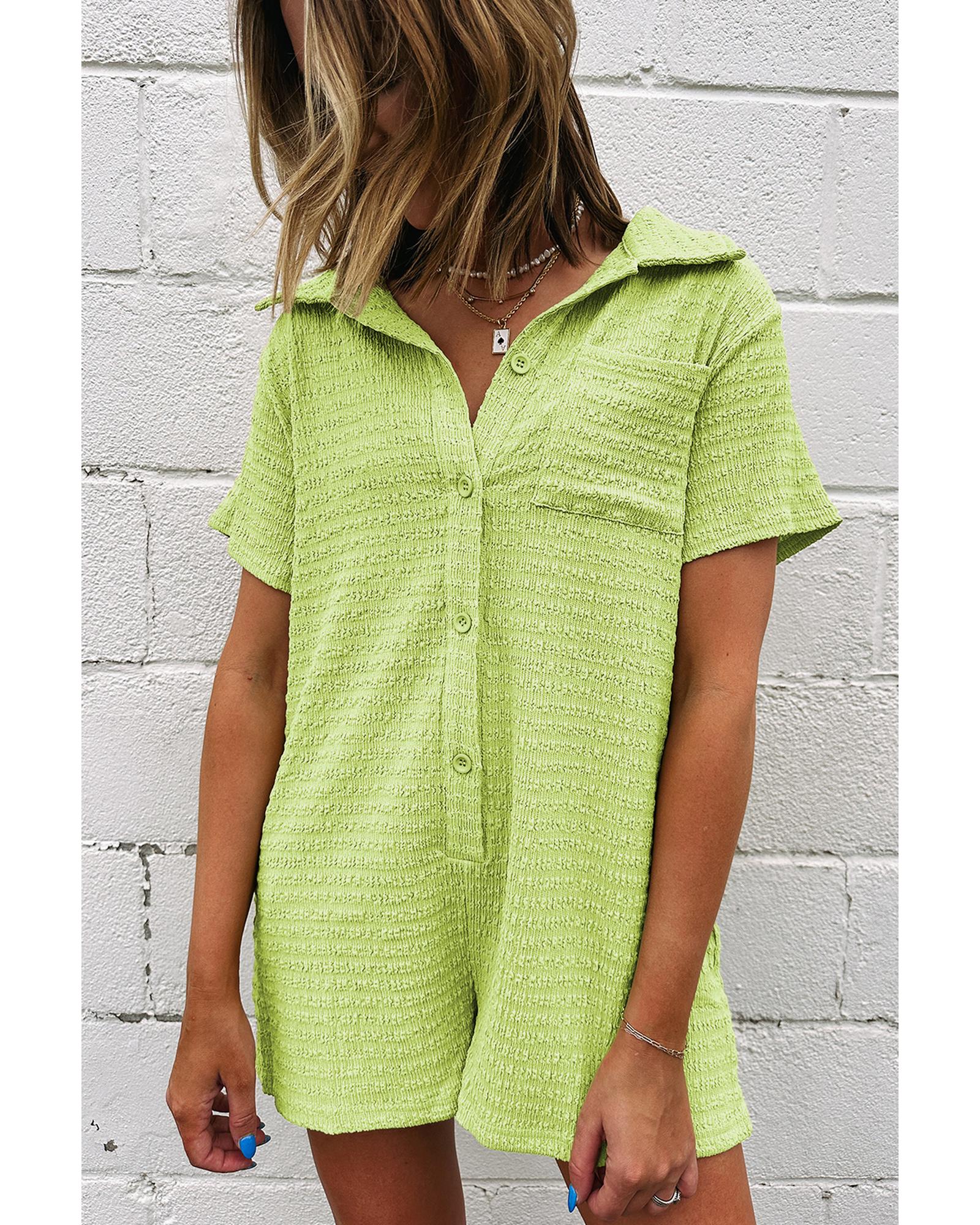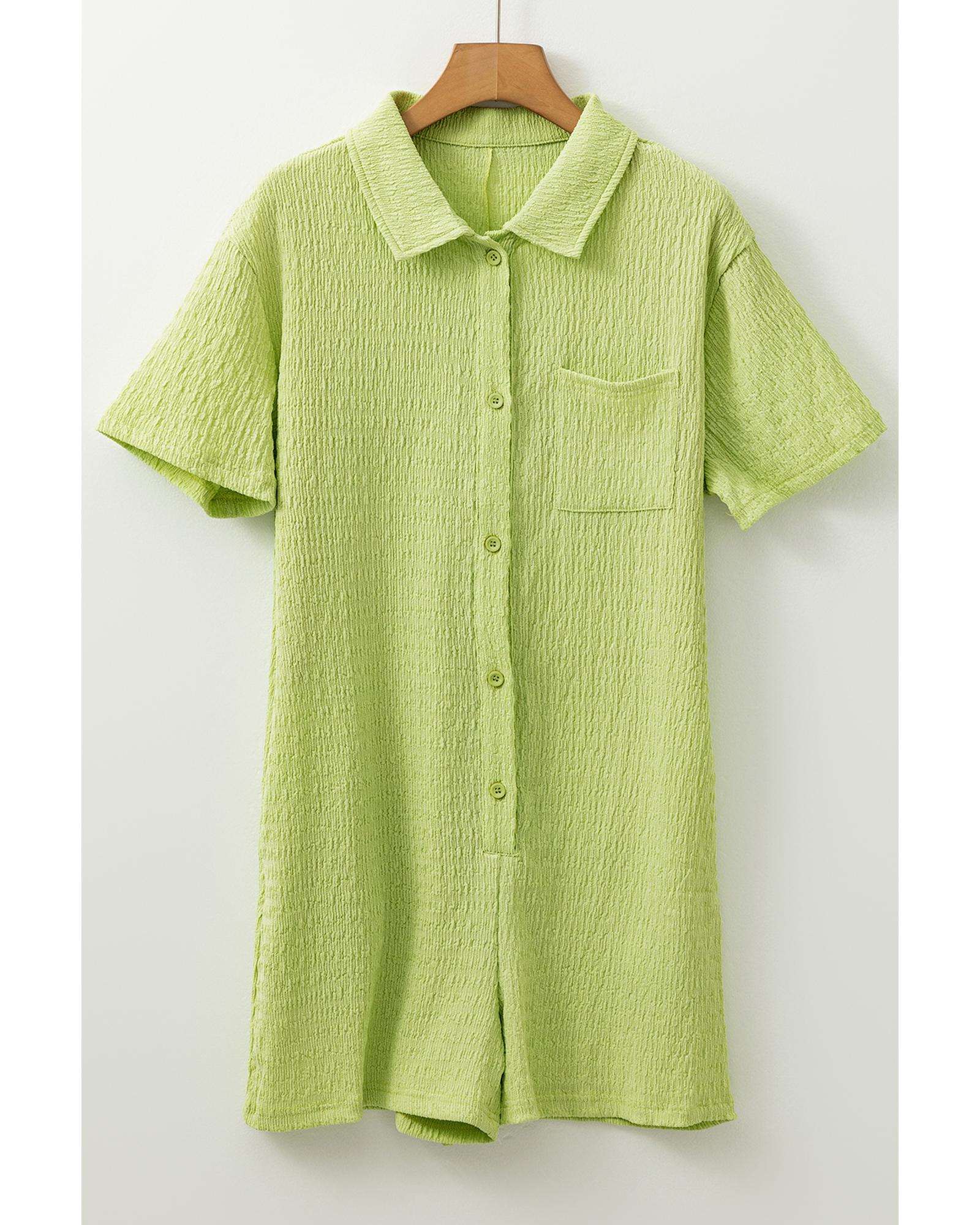 Meadow Mist Green Textured Short Sleeve Patched Pocket Buttoned Shirt Romper - S Original price was: $64.99.Current price is: $34.99.