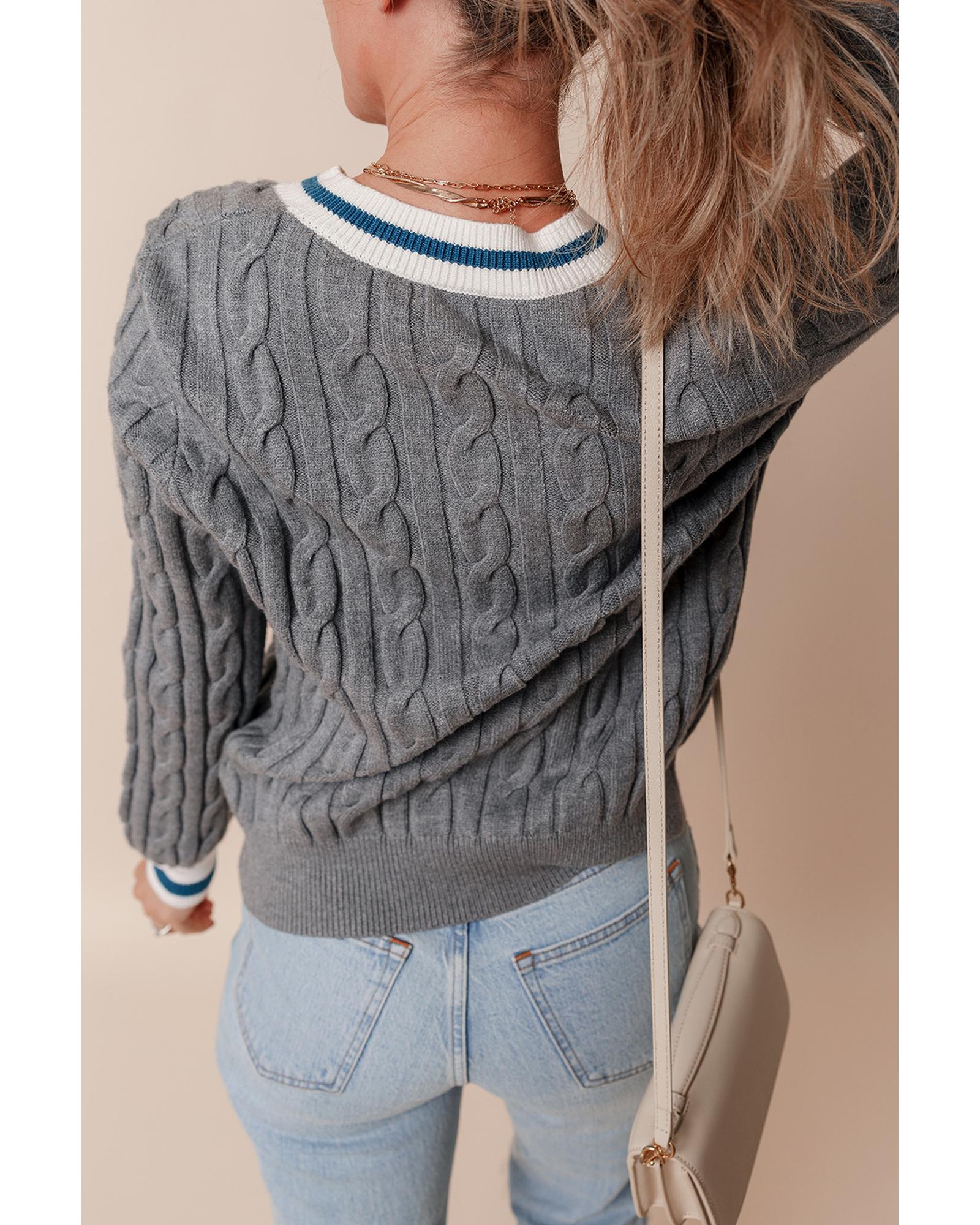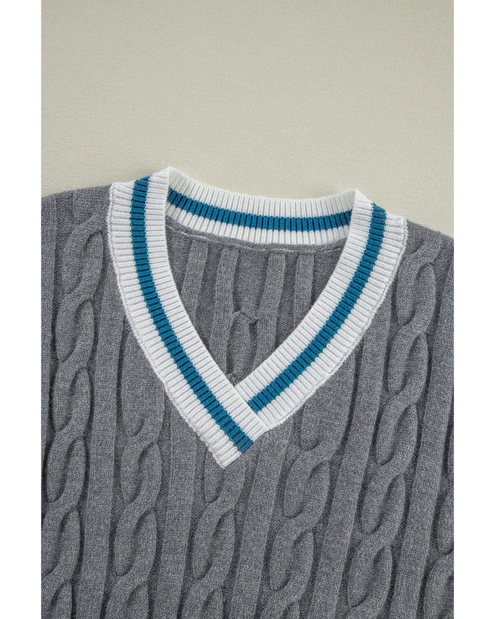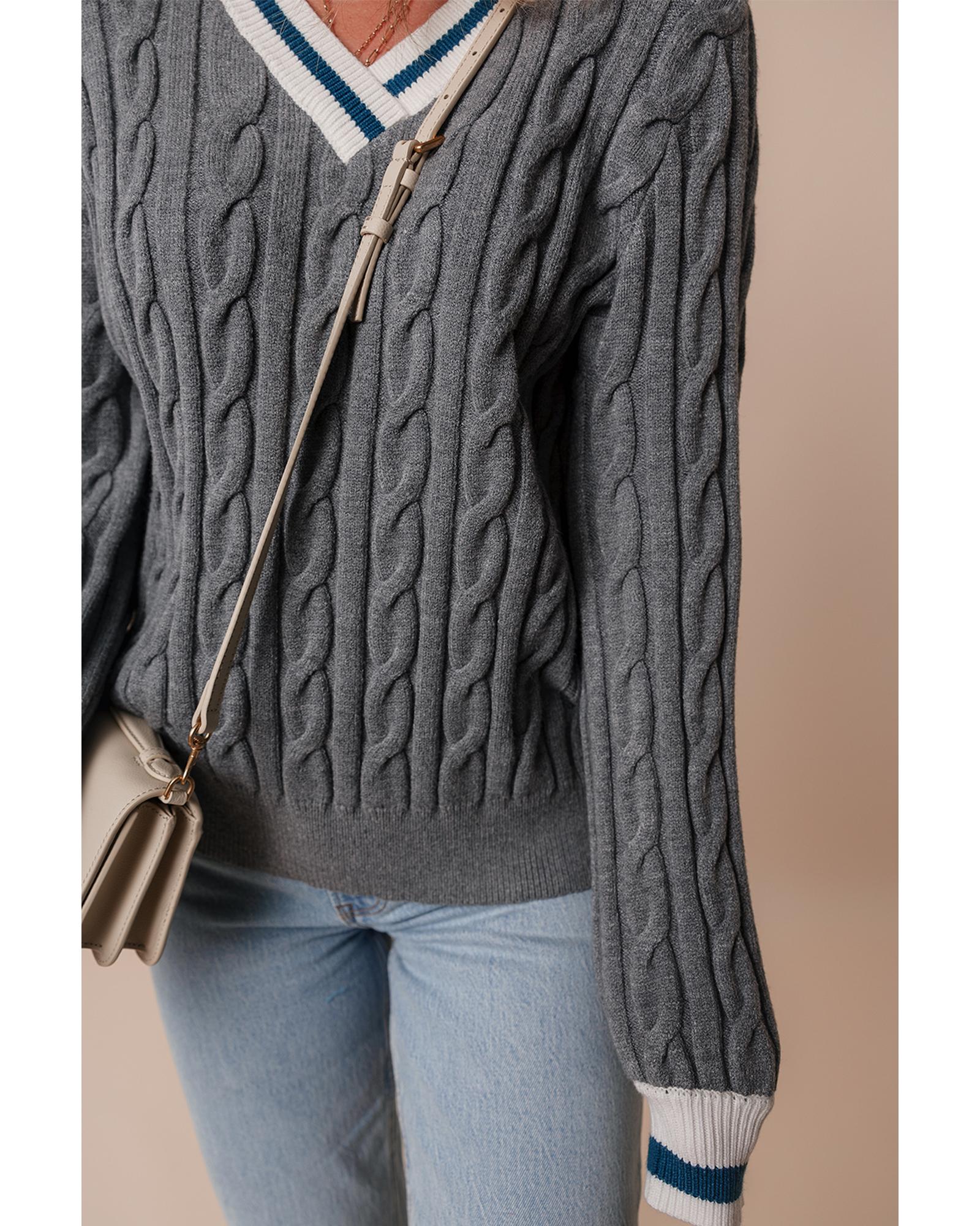 Medium Grey Color Contrast Ribbed Edge Cable Knit V Neck Sweater – 2XL