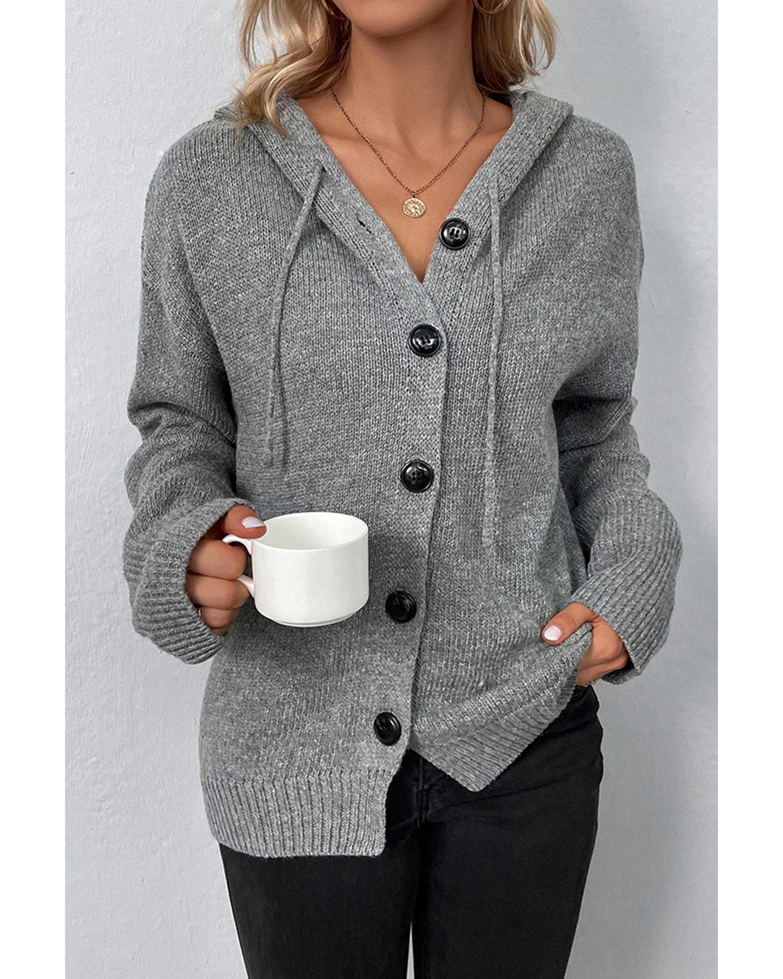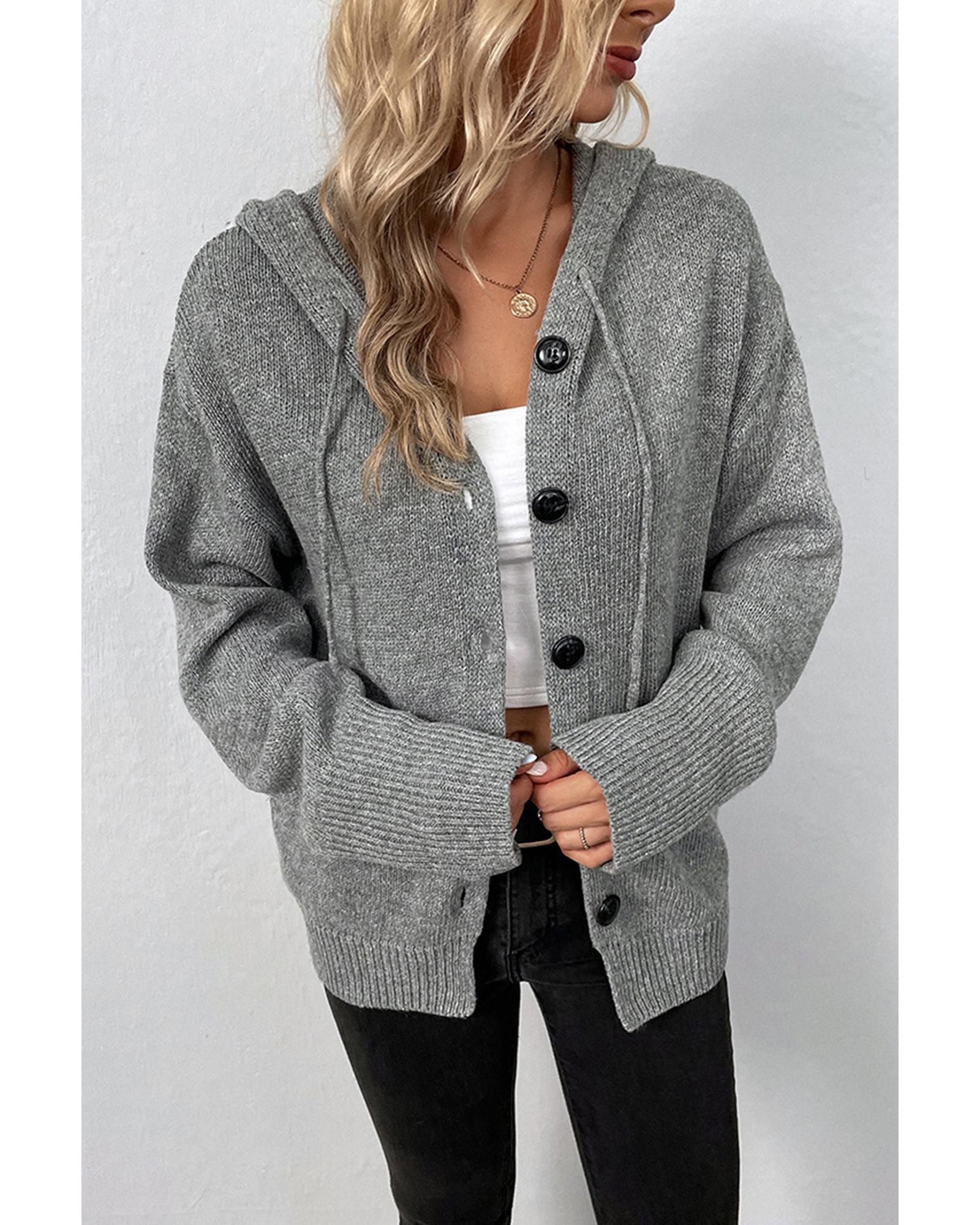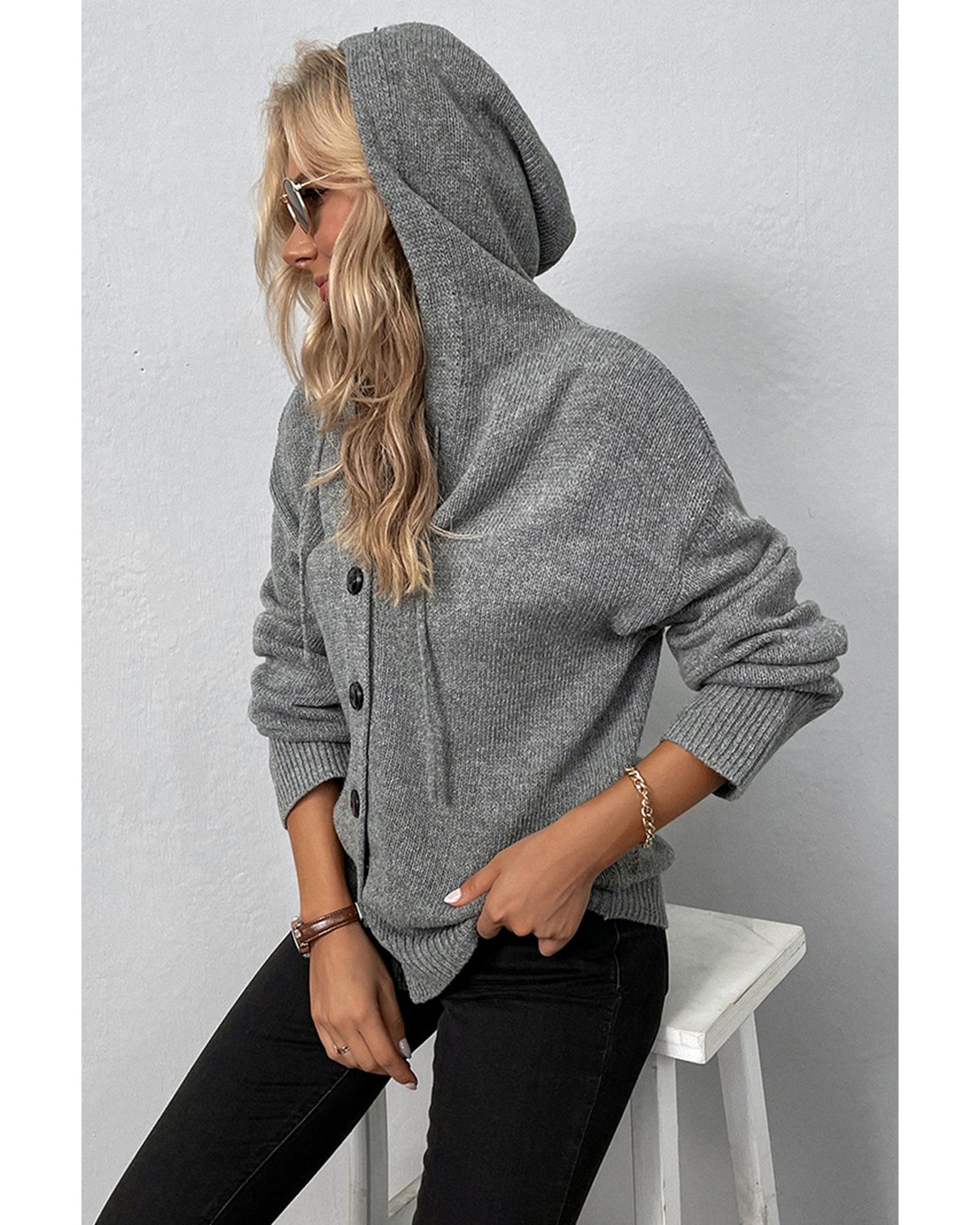 Medium Grey Drawstring Hooded Button Up Drop Shoulder Sweater Cardigan – S