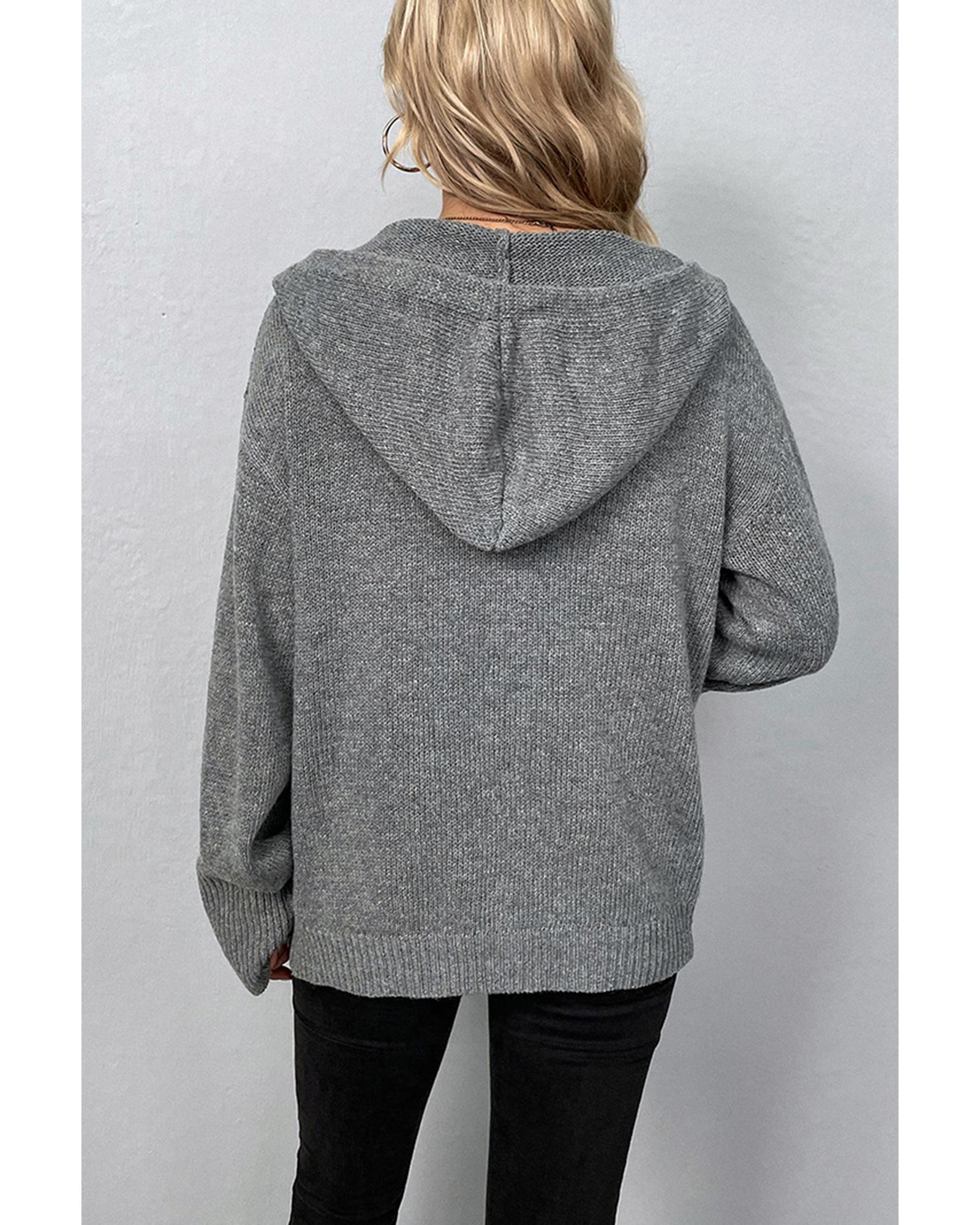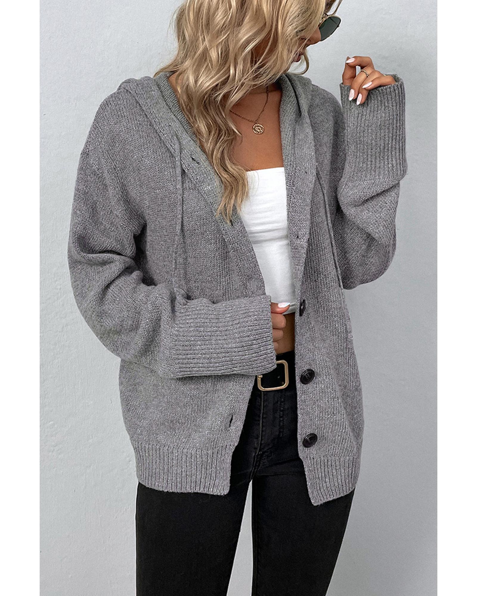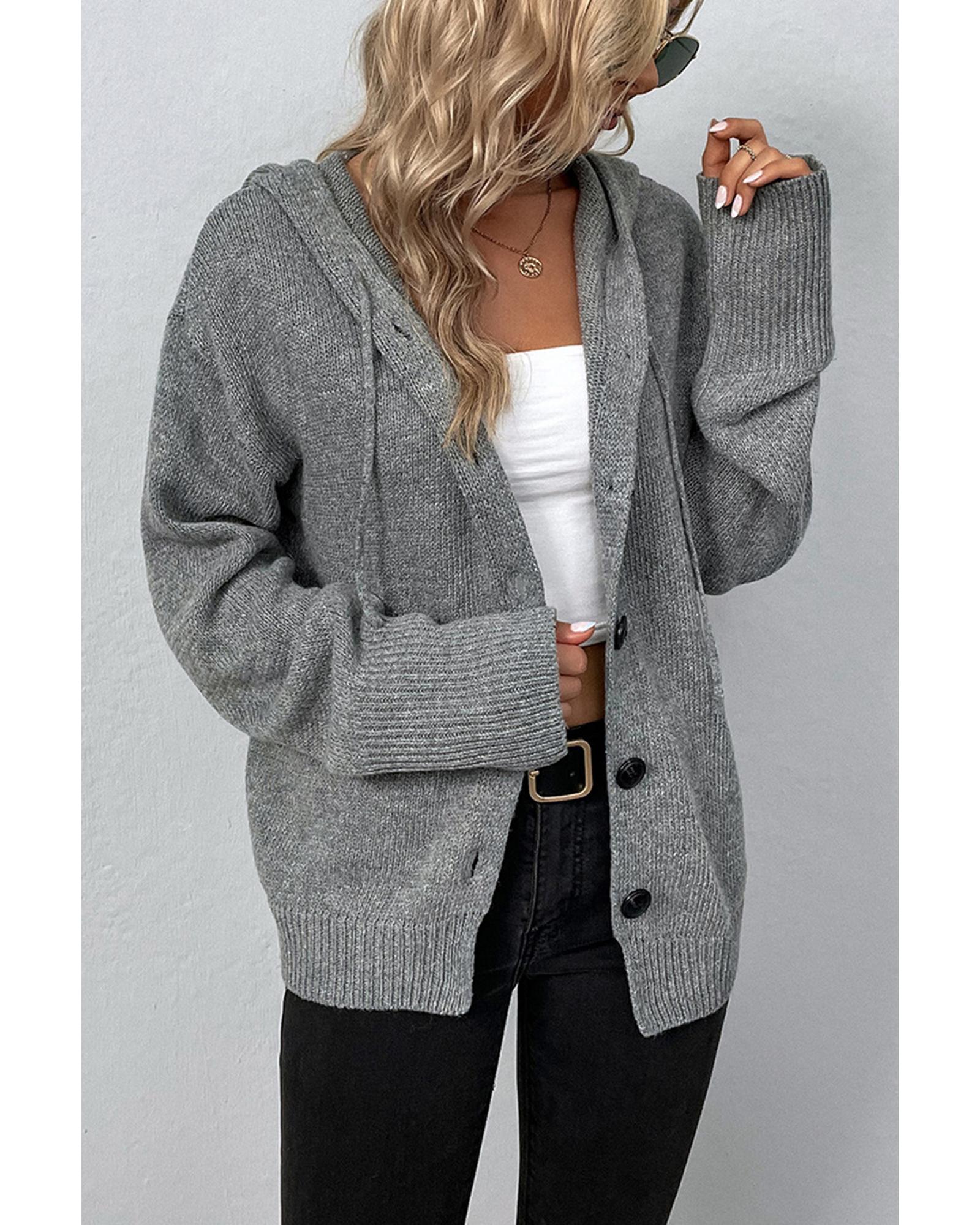 Medium Grey Drawstring Hooded Button Up Drop Shoulder Sweater Cardigan – S