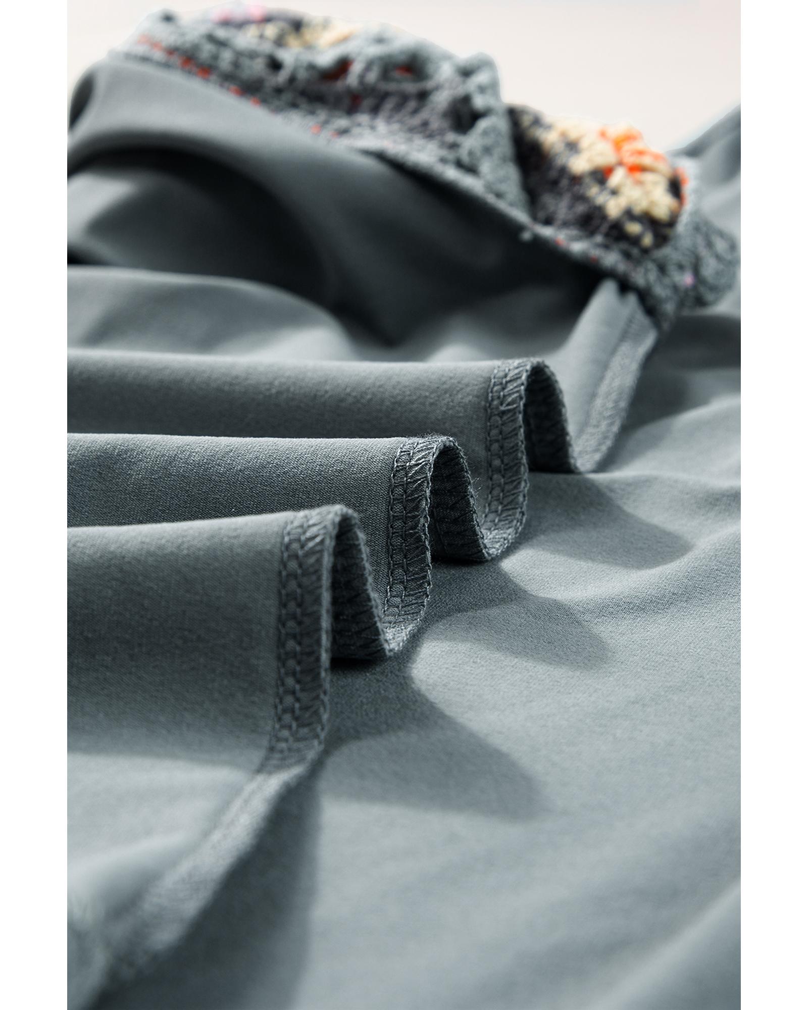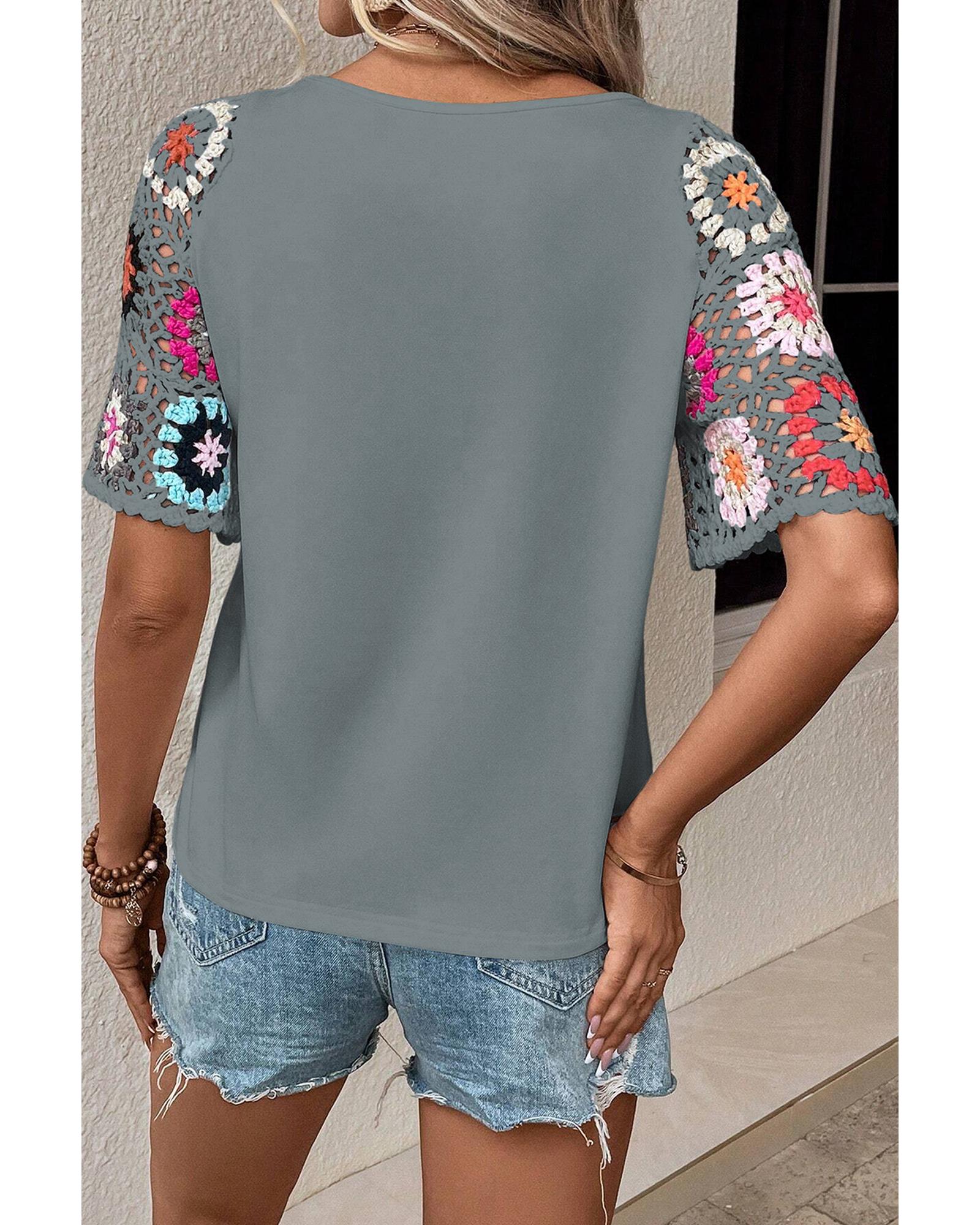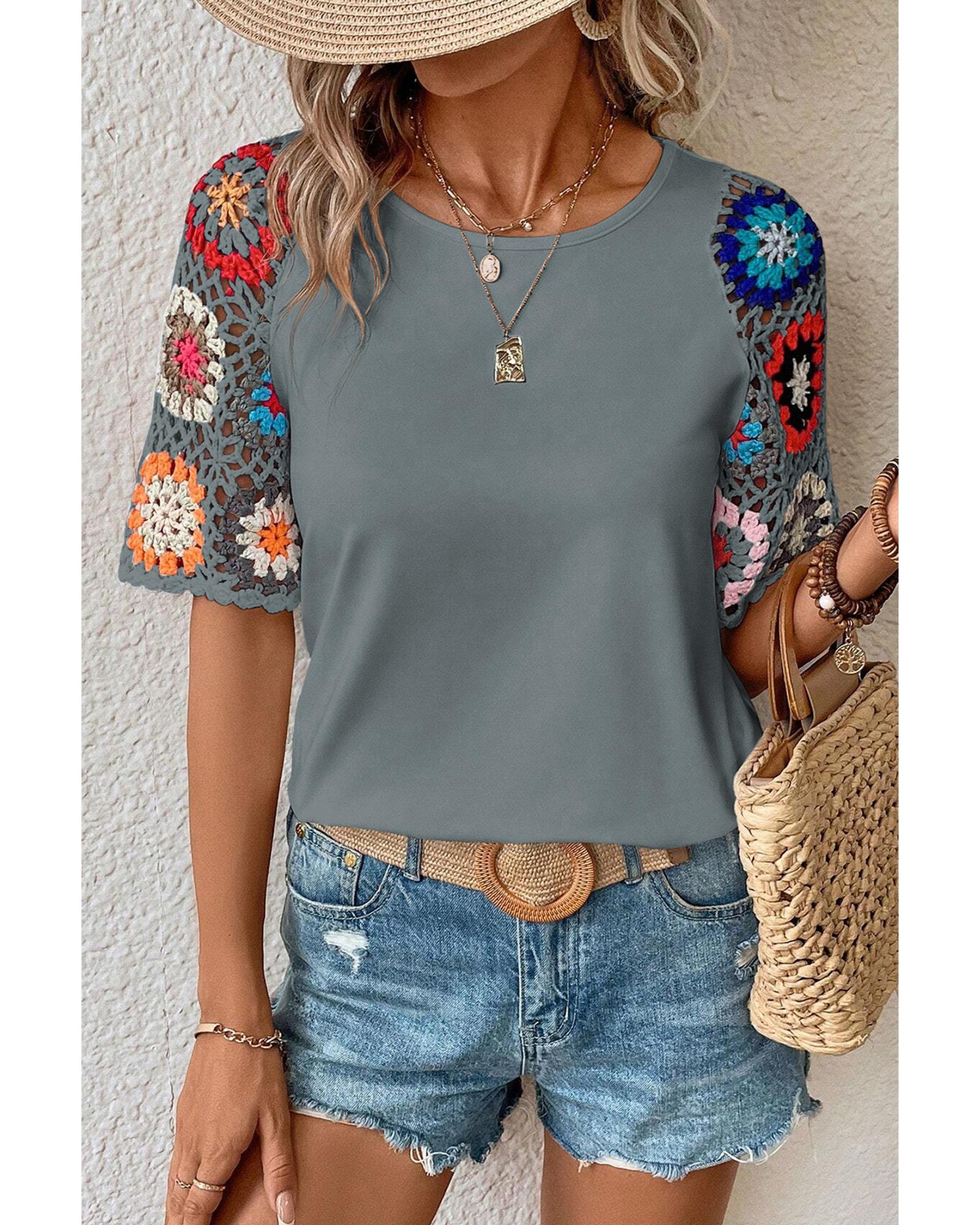 Medium Grey Floral Crochet Short Sleeve Top – S