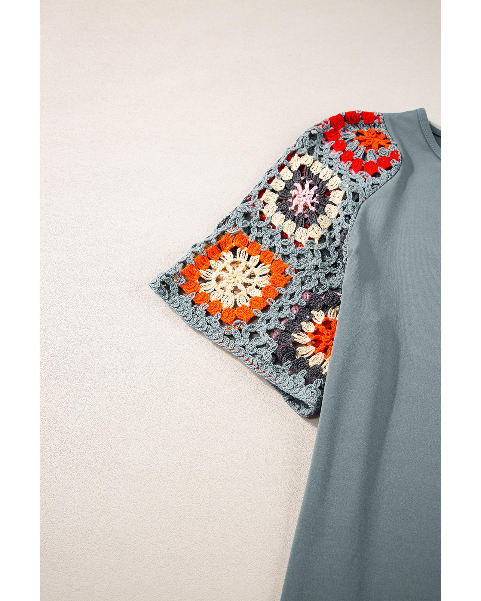 This floral crochet short sleeve top features a trendy fitted design with a relaxed silhouette, making it suitable for various casual occasions. Crafted from a stretch fabric, it offers comfort and style with a classic round neck and floral crochet detailing on the sleeves. Available in multiple sizes, it is designed to provide a flattering fit for different body types.