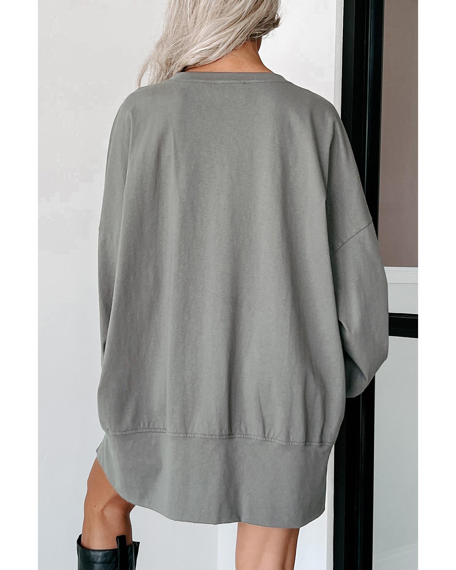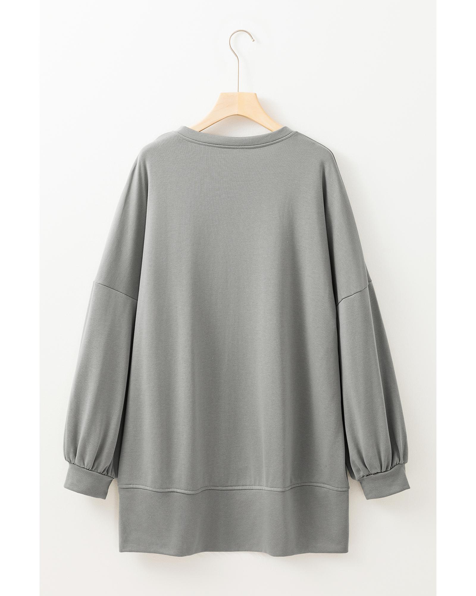 This stylish medium grey top features a festive sequin “Happy Halloween” graphic, perfect for celebrating the season. With a notched neck design and long sleeves, it offers both comfort and a relaxed fit, making it an ideal choice for casual outings.