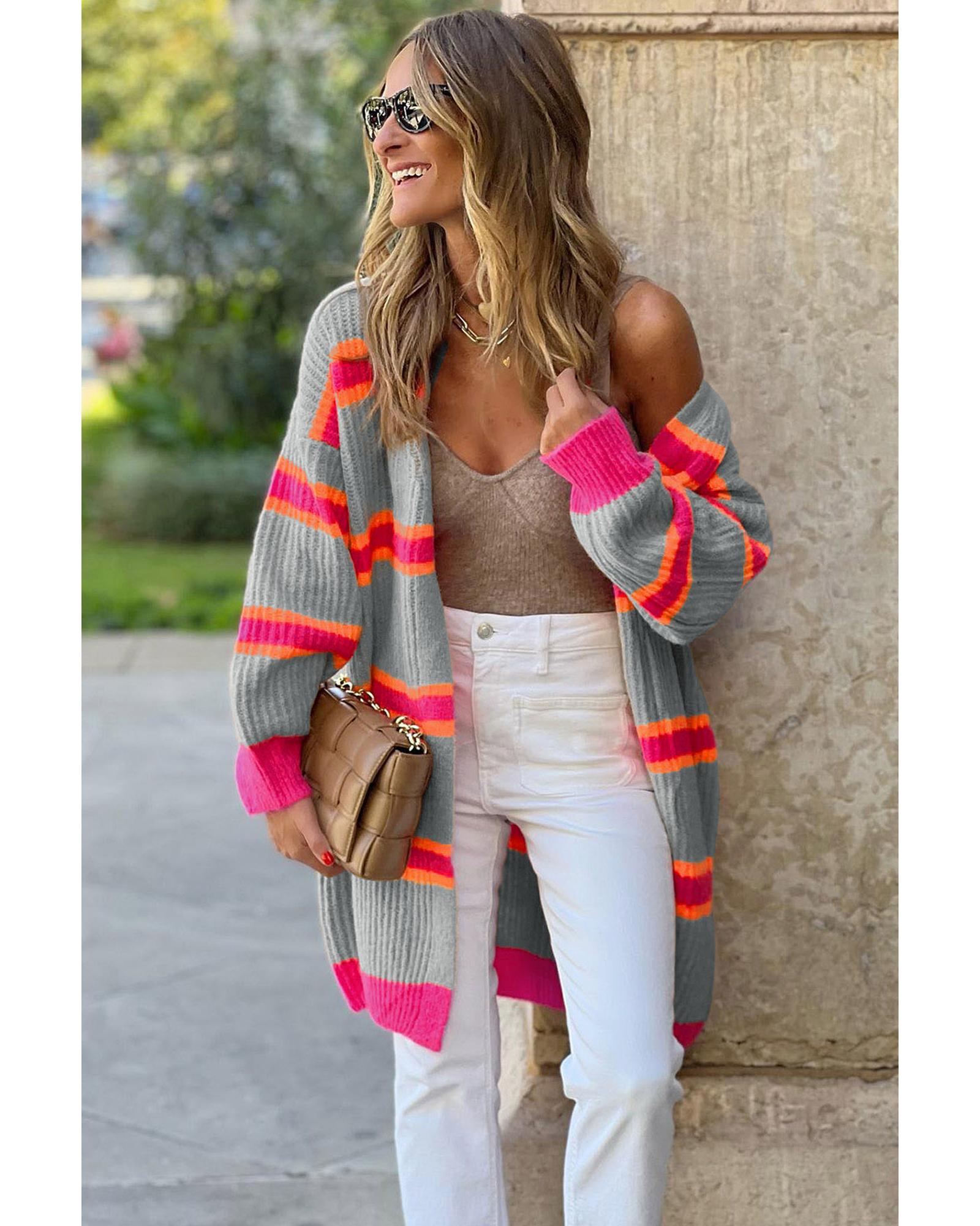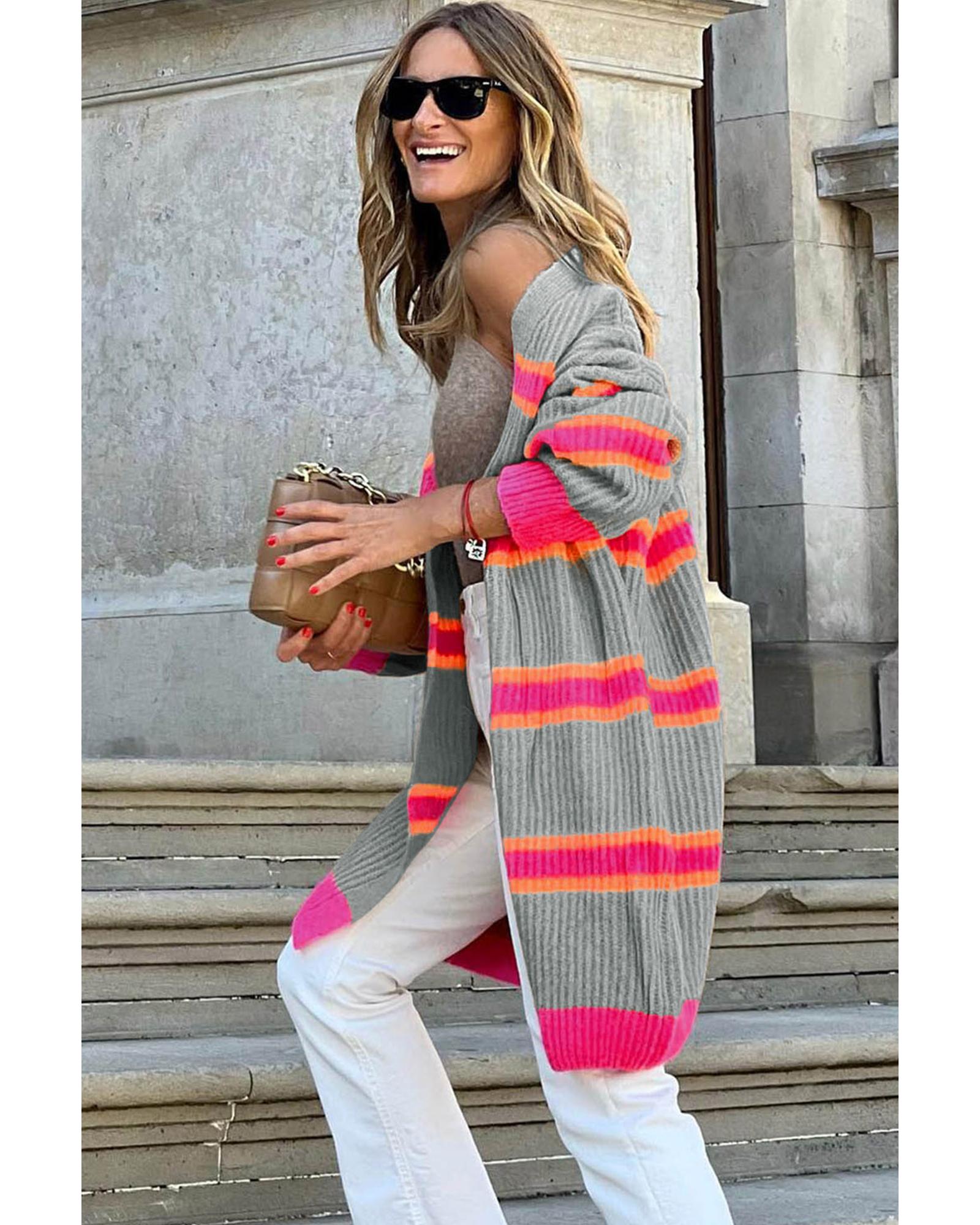 This long knitted cardigan features a stylish grey stripe pattern and a ribbed texture, offering a trendy and versatile addition to your wardrobe. Its long length provides extra warmth and coverage, making it suitable for various casual or dressed-up looks. Crafted from soft and stretchy acrylic fabric, it ensures comfort and ease of layering.