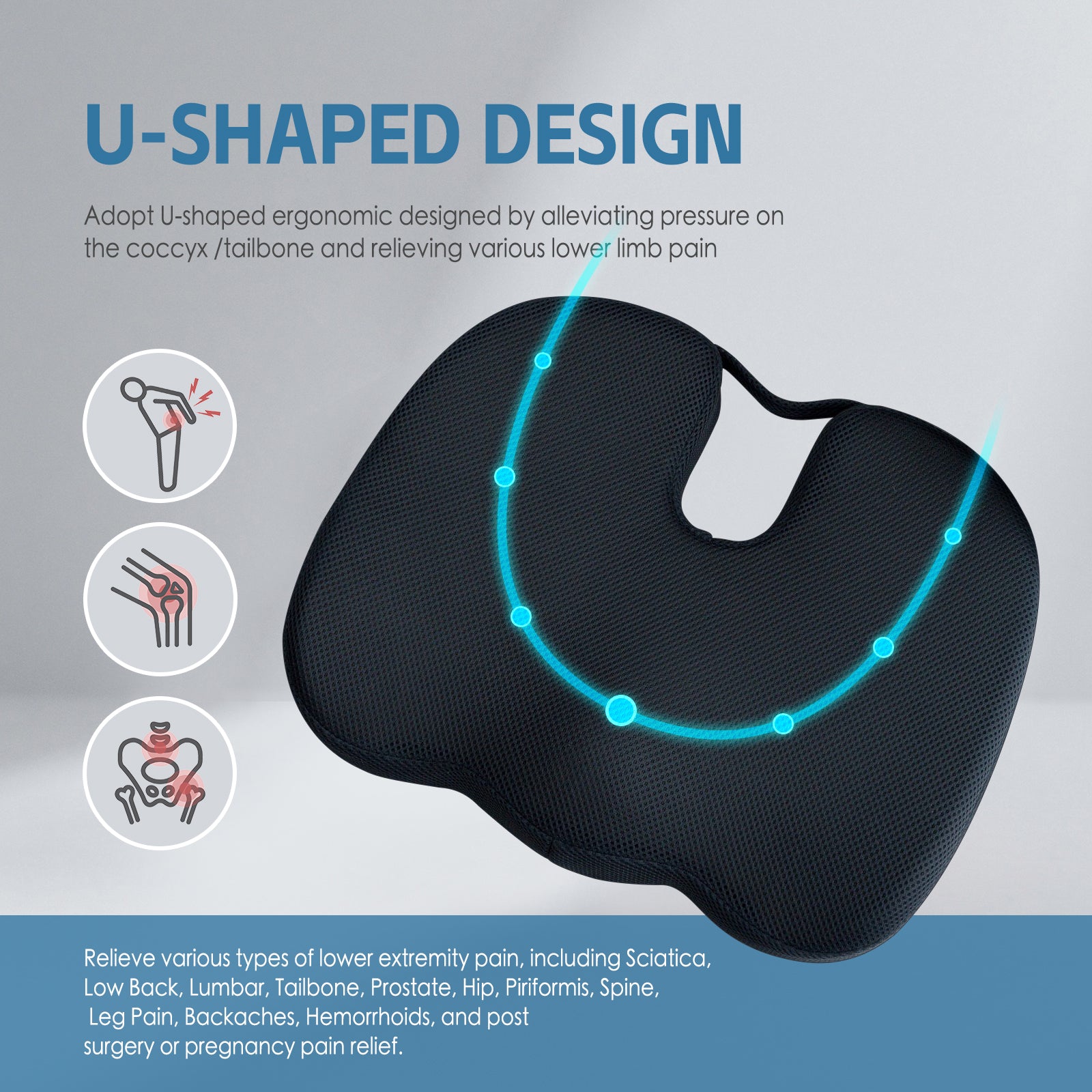 This memory foam seat cushion is designed to promote healthy posture and provide comfort during extended sitting periods. Its ergonomic design helps support the hips, tailbone, and lower back, reducing pressure and alleviating discomfort caused by long sitting sessions.