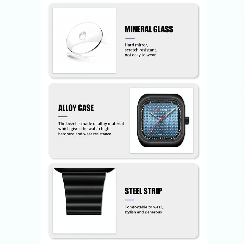 • Package includes one casual steel strap square men’s quartz watch