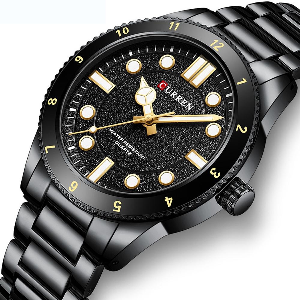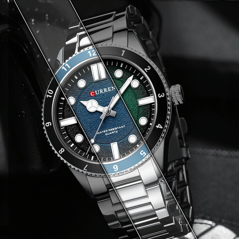 This men’s steel strap quartz watch features a sporty design with a square dial and luminous pointers. It combines durability and style with a lightweight alloy case, wear-resistant glass, and a secure folding titanium buckle. The watch is designed for easy time adjustment with a screw crown and offers a high-quality appearance suitable for various occasions.