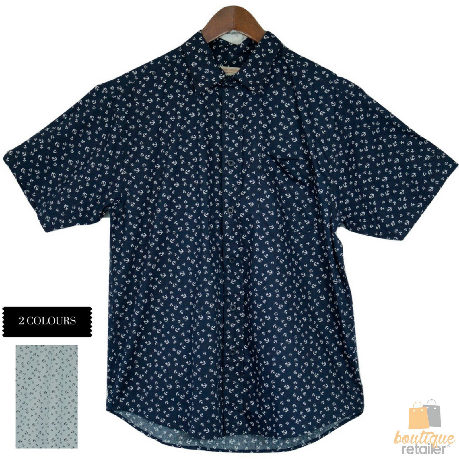 This men’s marine anchor shirt is a casual short sleeve top made from 100% cotton, suitable for summer wear. It features a vintage design with a single back pleat and a single front pocket, making it versatile for both dressing up and down.