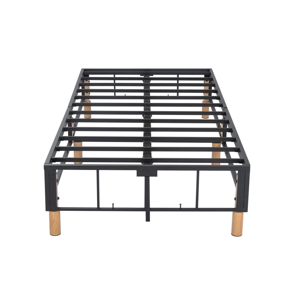 This metal bedframe mattress foundation in dark grey offers a combination of durability, stability, and aesthetic appeal. Constructed entirely from metal with a linen-wrapped exterior and cotton-gasket-covered contact points, it provides a quiet and comfortable sleeping environment. The design includes multiple support legs and a gap for easy cleaning, making it a practical addition to any bedroom.