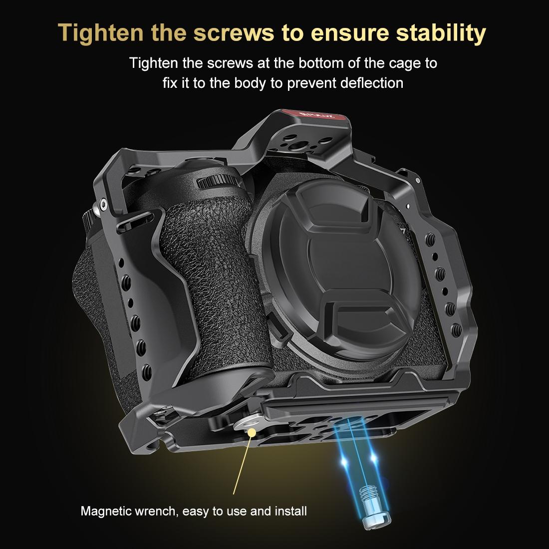 This metal camera cage is designed for Nikon Z6Iii and Z6Ii cameras, providing a sturdy and versatile rig for stabilizer use. It offers unobstructed access to camera buttons and the flip screen, facilitating easy operation and quick battery disassembly. Crafted from aviation aluminum alloy, the cage ensures durability and lightweight handling. It features multiple 1/4 and 3/8 screw holes for quick attachment and switching of accessories, supporting both horizontal and vertical shooting modes. A built-in wrench allows for convenient disassembly and assembly, while the cage design prevents covering essential buttons and the battery compartment. Multiple attachment points are available for external monitors, focus follow systems, tripods, and microphones.