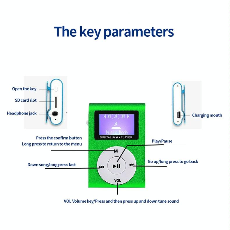 This compact metal mini MP3 player features a monochrome screen and supports MP3 audio format. It is designed with a button operation mode and includes a 3.5mm headphone jack for easy listening. The device offers a simple interface with a USB 2.0 connection and supports TF cards for expanded storage. Its lightweight design makes it portable and convenient for everyday use.