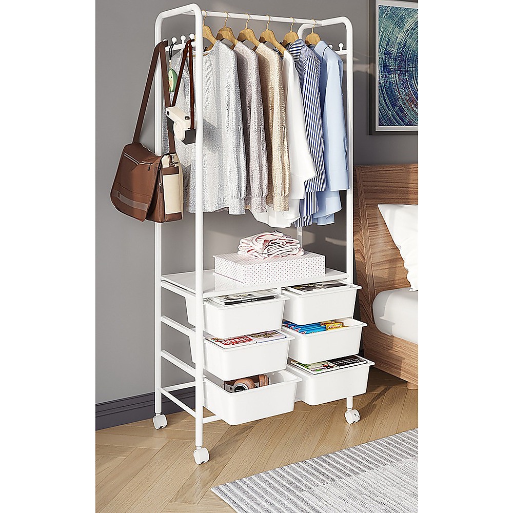 This metal open wardrobe offers a modern storage solution for those with limited closet space. It features a sturdy metal frame, multiple storage drawers, side hooks, and an additional top shelf, making it ideal for organizing clothing, shoes, and accessories. Its stylish design complements various room decors and provides convenient mobility with built-in wheels.
