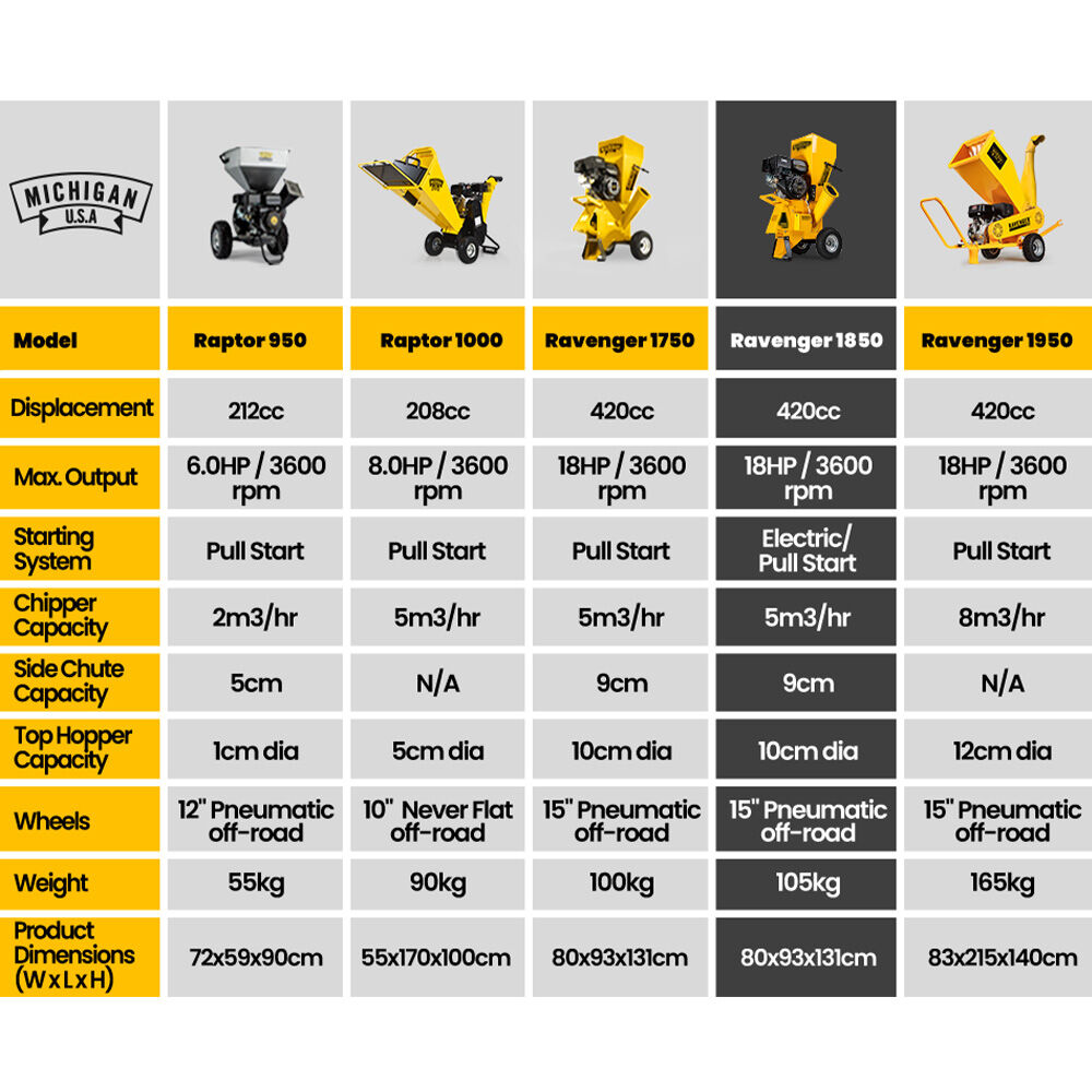 MICHIGAN 18HP 420cc Petrol Commercial Wood Chipper, Electric Key Start, Tree Mulcher – Ravenger 1850