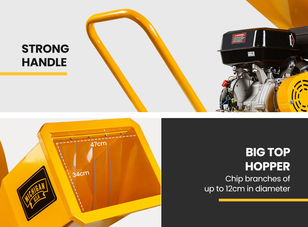 • Oversized hopper capable of handling branches up to 12cm in diameter