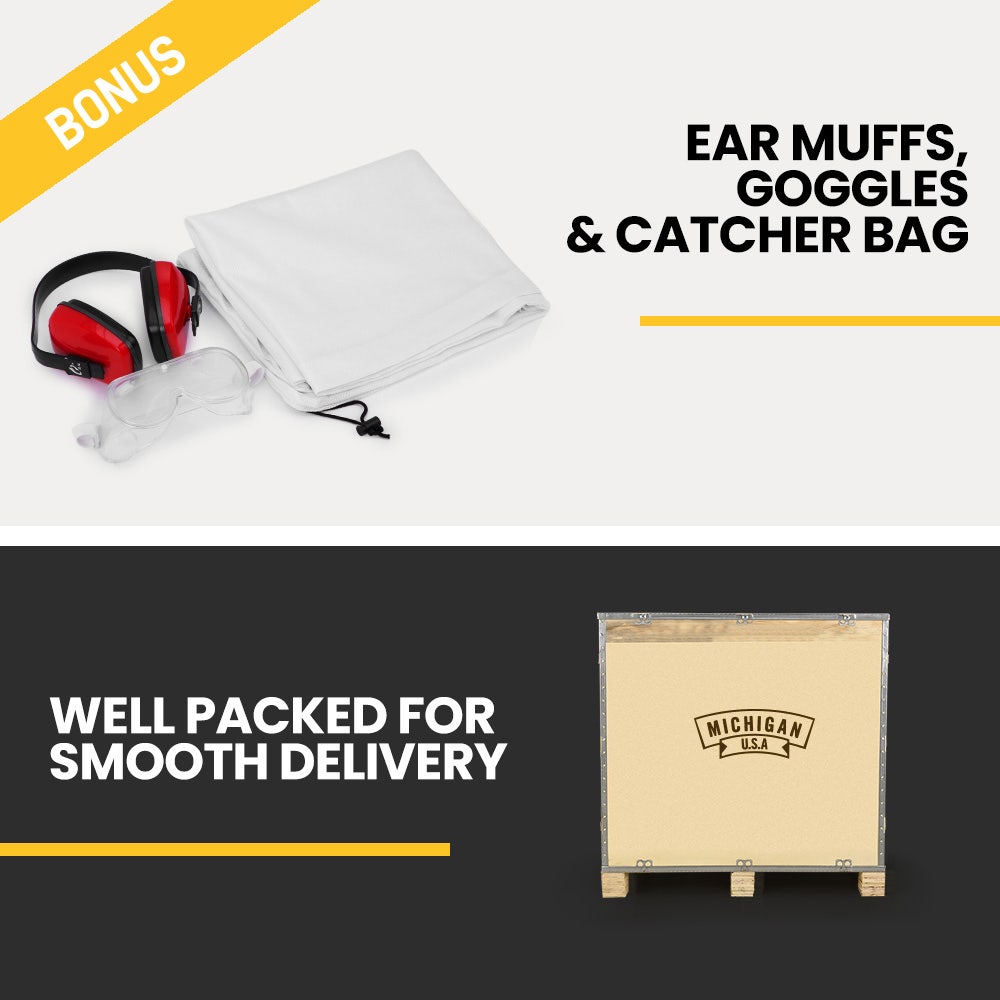 - Includes collection bag, goggles, and ear muffs