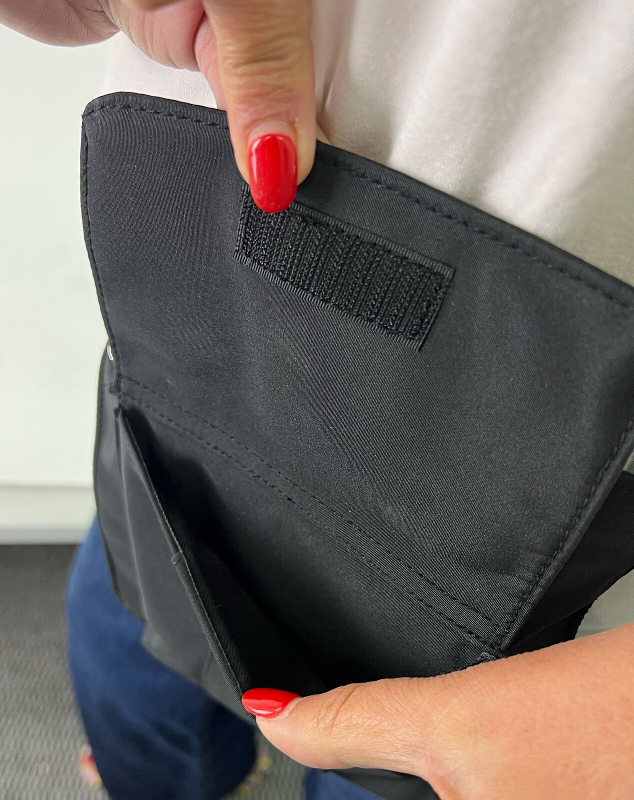 - Multiple compartments including a top zip pocket and a front flap hook-and-loop pouch for secure storage