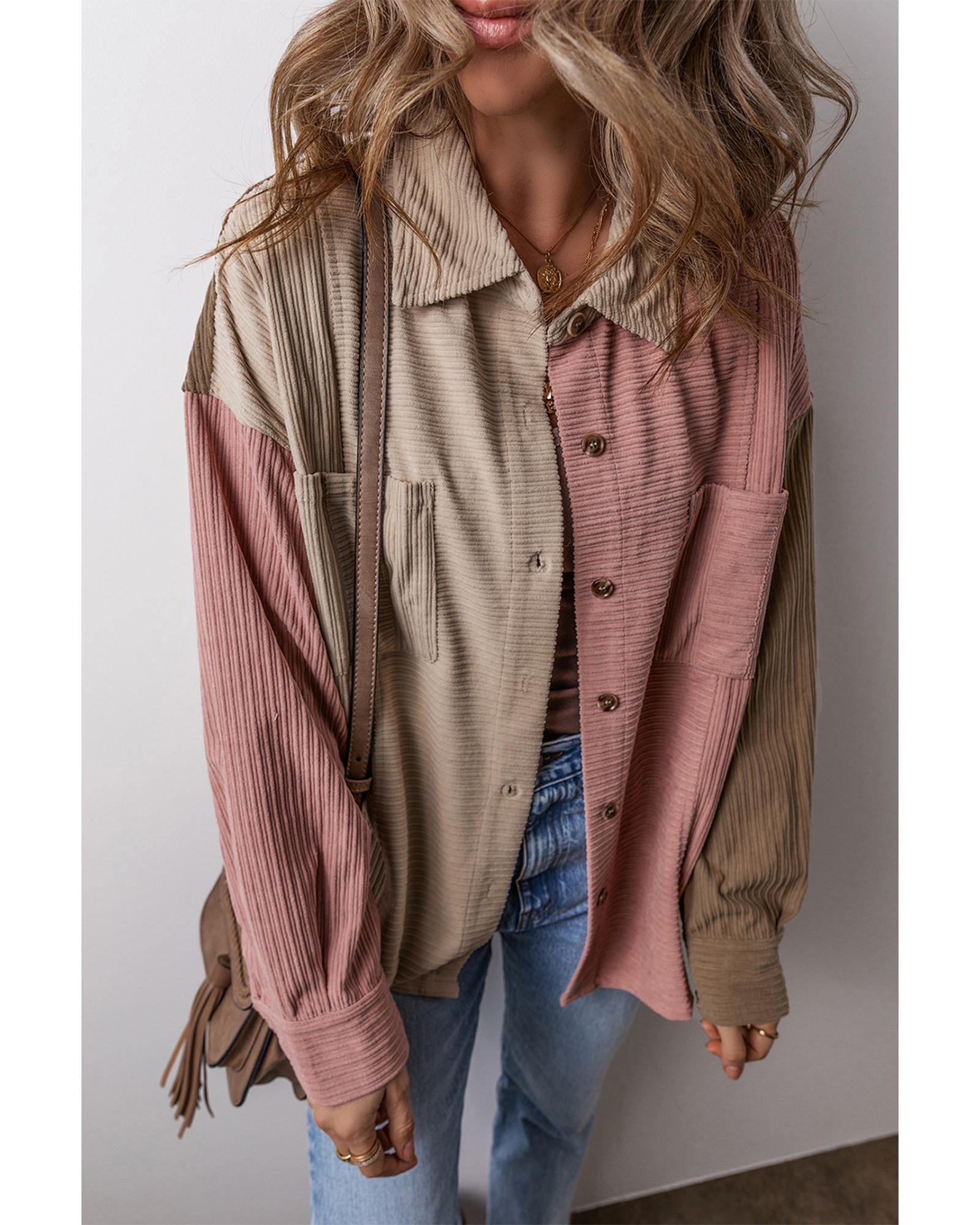 This mineral red color block shacket features a stylish design with functional chest pockets and a buttoned front, making it a versatile addition to your wardrobe. Crafted from warm and cozy corduroy fabric, it offers both comfort and retro flair, perfect for layering during cooler months.