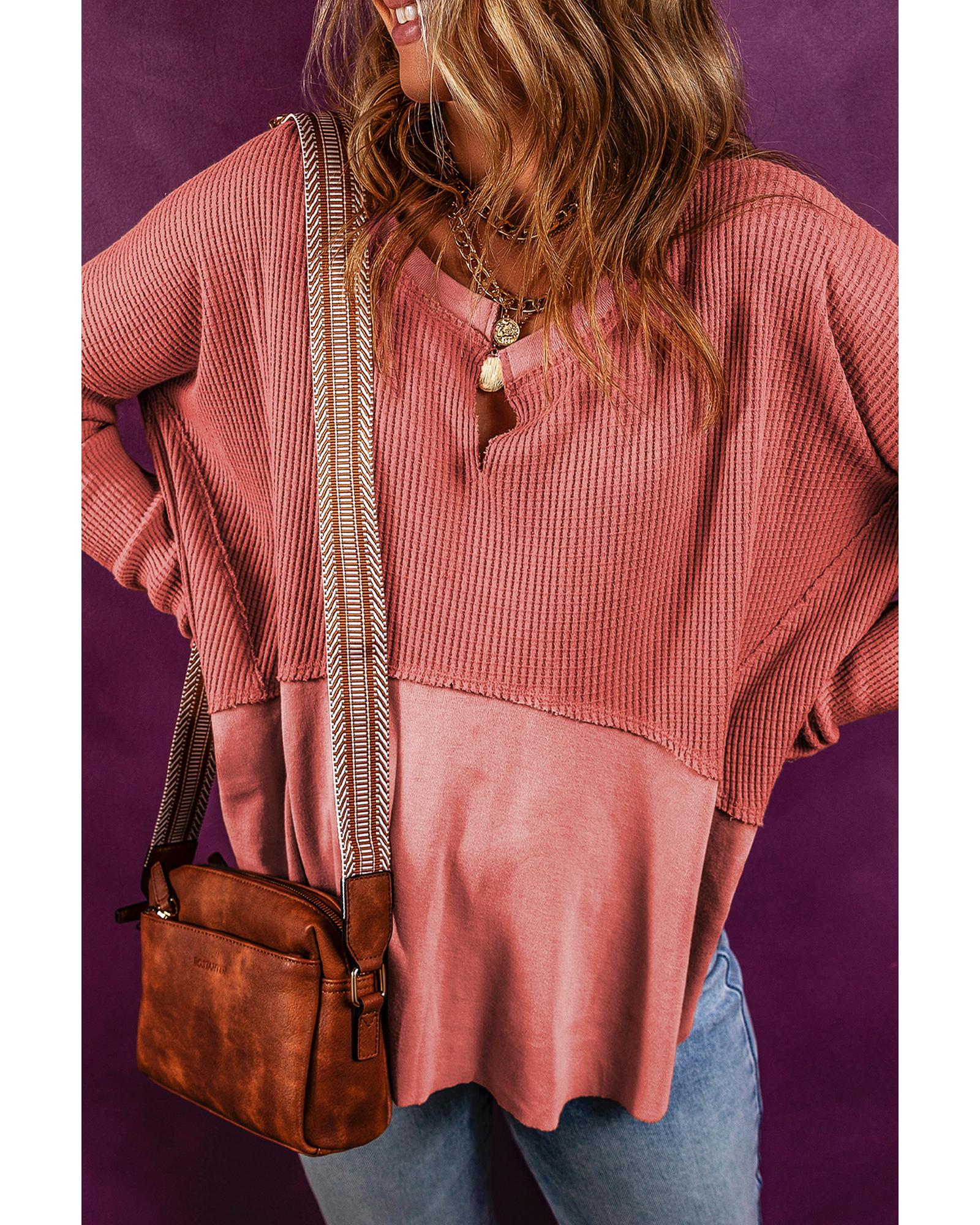 Mineral Red Exposed Seam Slit Neck Waffle Knit Patchwork Top – L