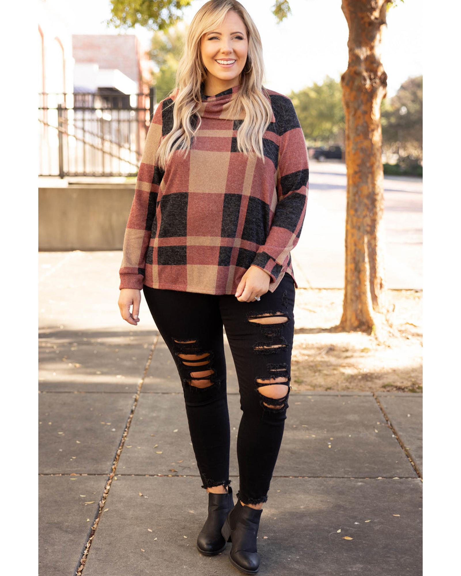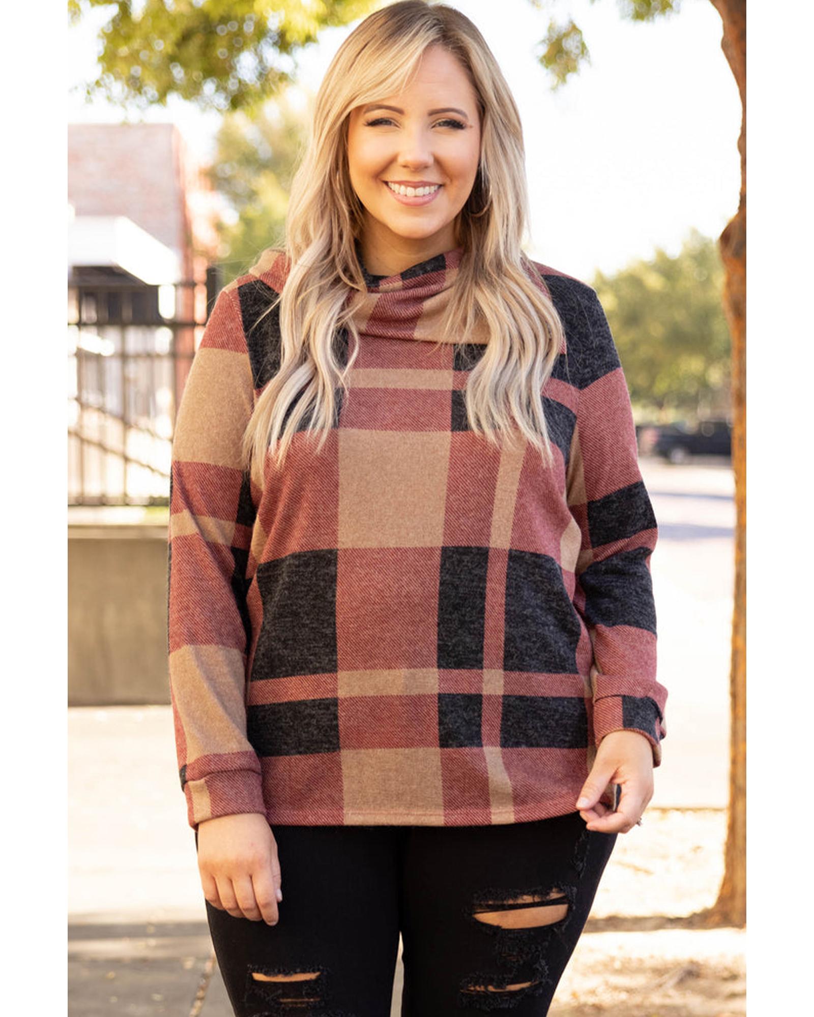 This plus size top features a stylish mineral red plaid print with a unique asymmetric neckline. Designed for a trendy, fitted look, it offers a comfortable fit suitable for various occasions. The top is made from high-quality materials, ensuring durability and comfort.