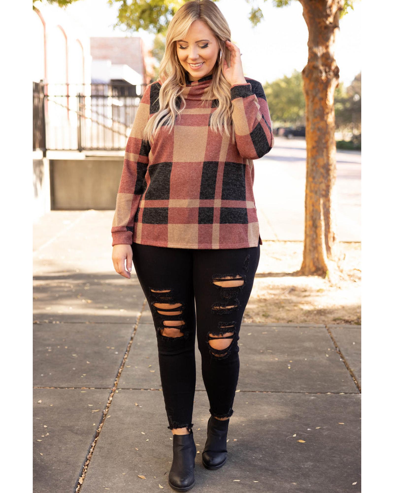 This plus size top features a stylish mineral red plaid print with a unique asymmetric neckline. Designed for a trendy fitted look, it combines comfort with fashionable details, making it suitable for various casual occasions.
