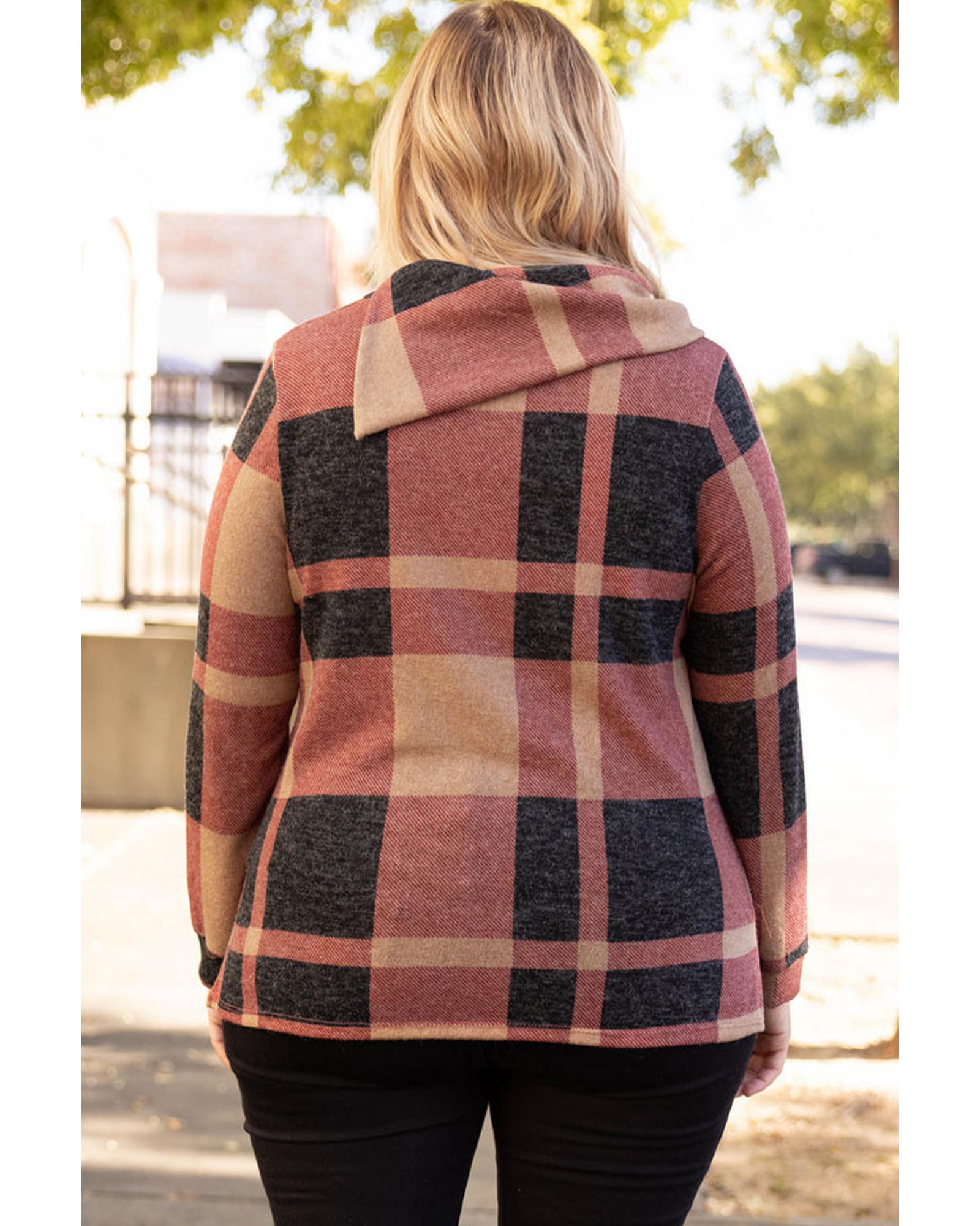 Mineral Red Plus Size Plaid Print Button Decor Asymmetric Neck Top – 3X