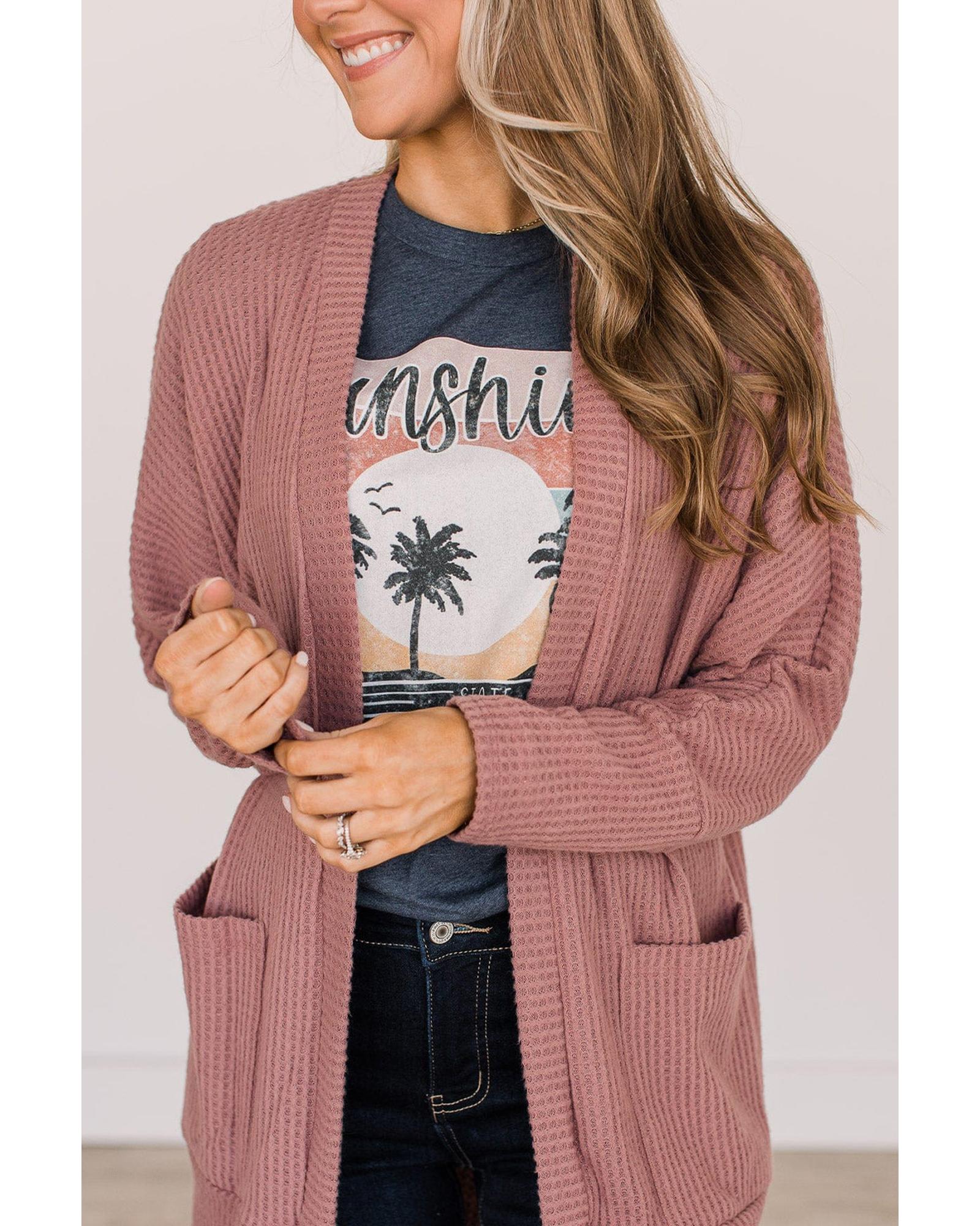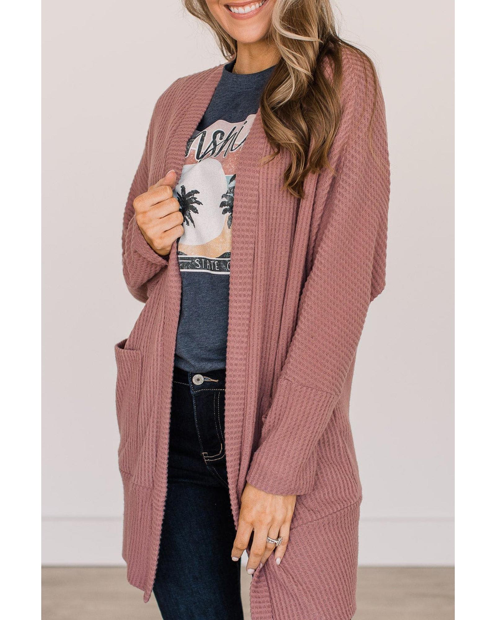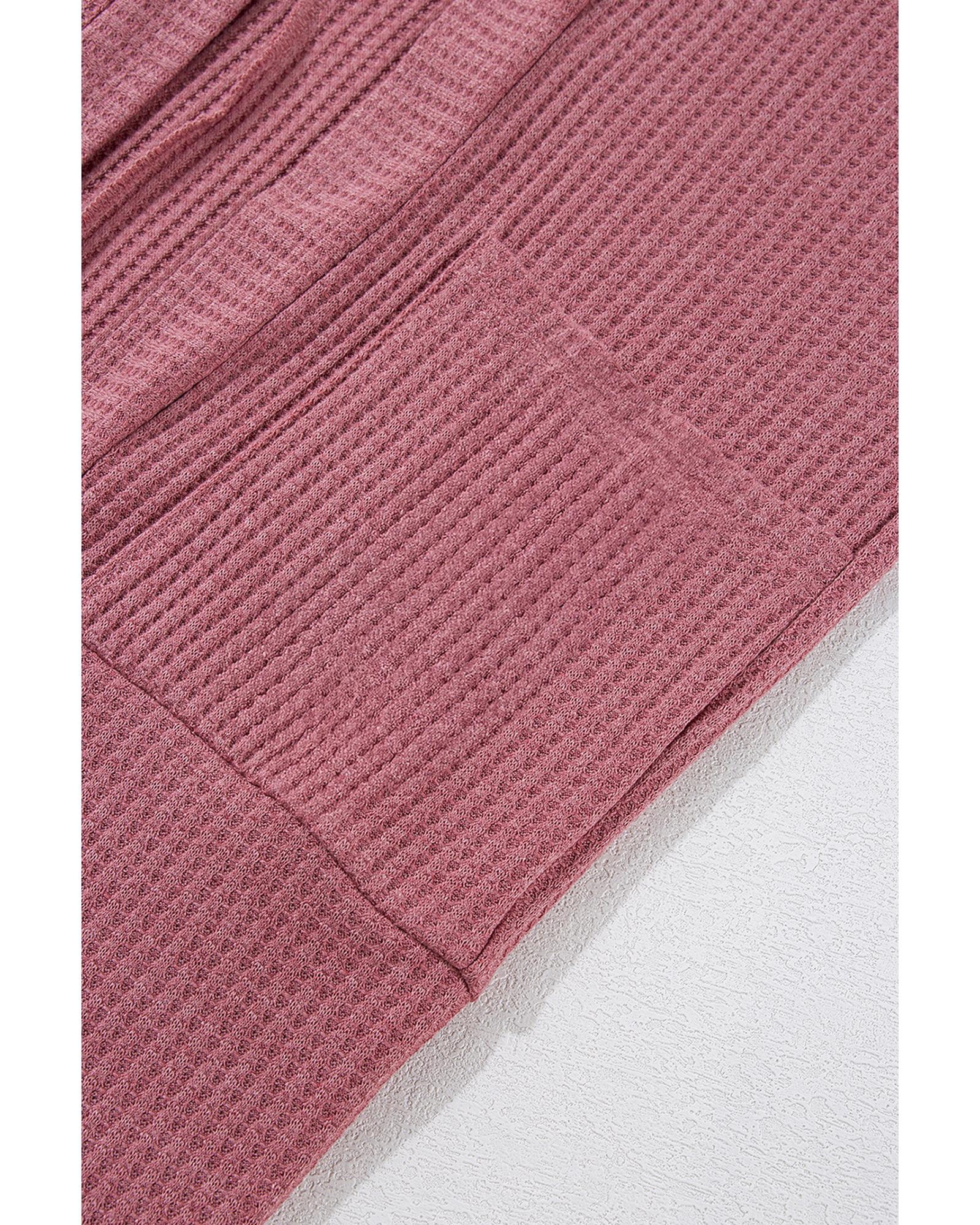 This mineral red solid color waffle knit cardigan features a classic open front design with pocket details, offering a versatile and timeless style. Its high elasticity and comfortable fit make it suitable for various occasions and easy to pair with different outfits.