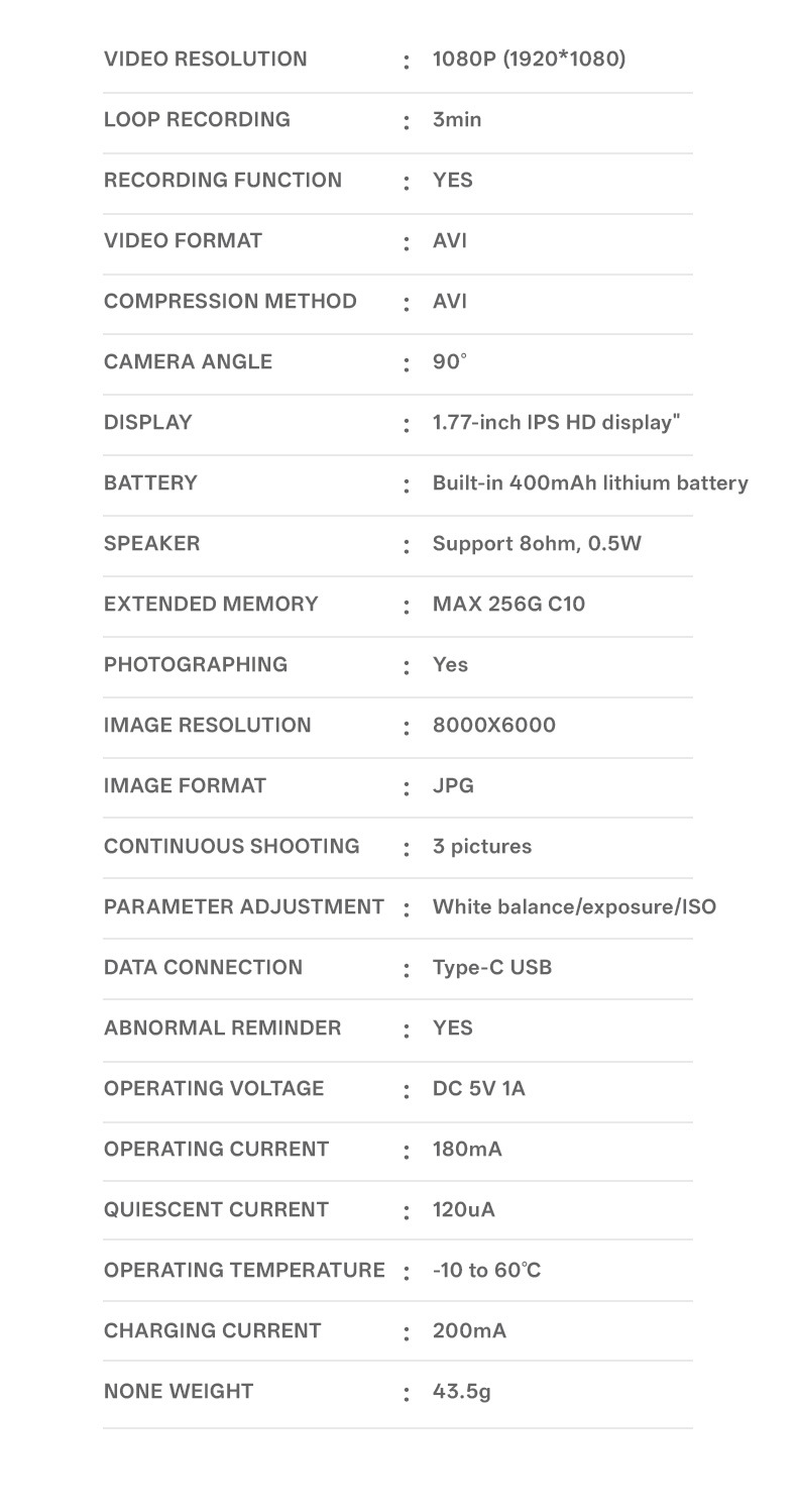 - Long-lasting 400mAh battery supporting up to 80 minutes of recording