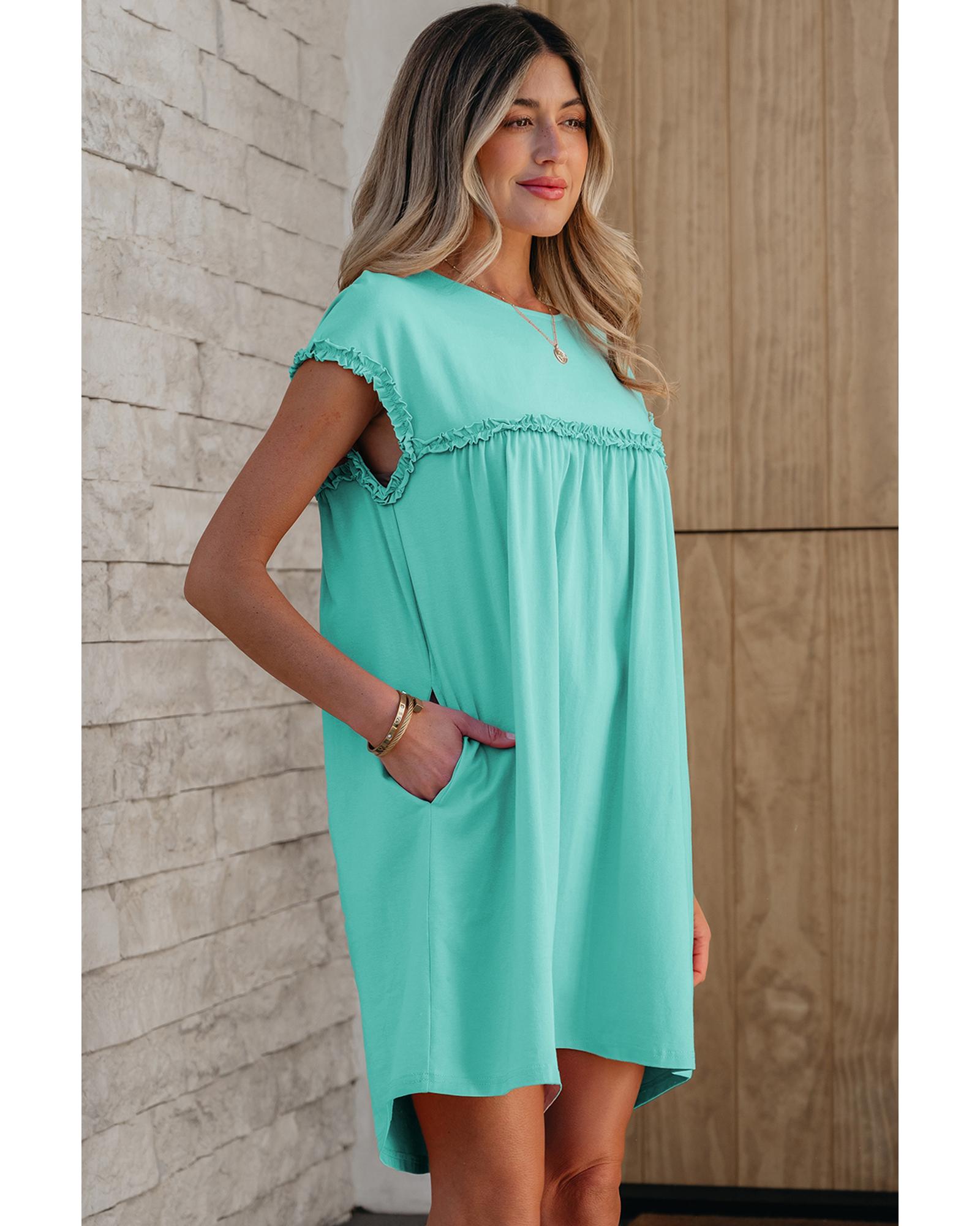 This mint green mini dress features a relaxed fit and stylish frilled trim details, creating a chic and standout look. The crew neck design adds to its effortless style, making it suitable for various occasions. Crafted from high-quality materials, it offers durability and comfort.