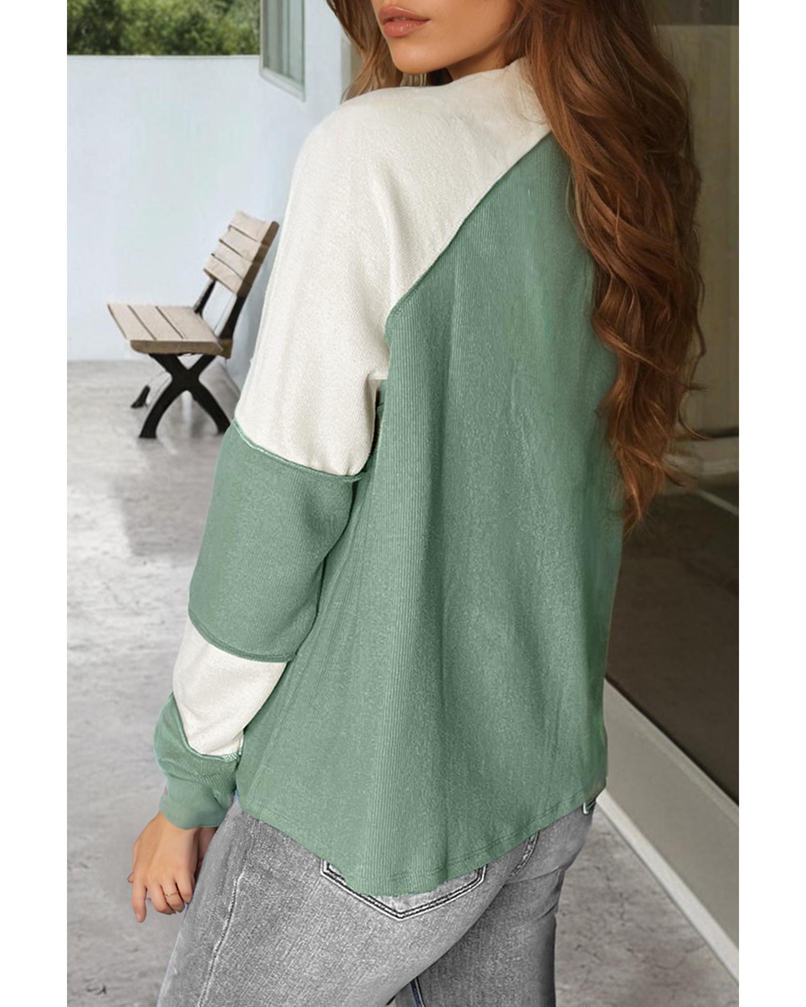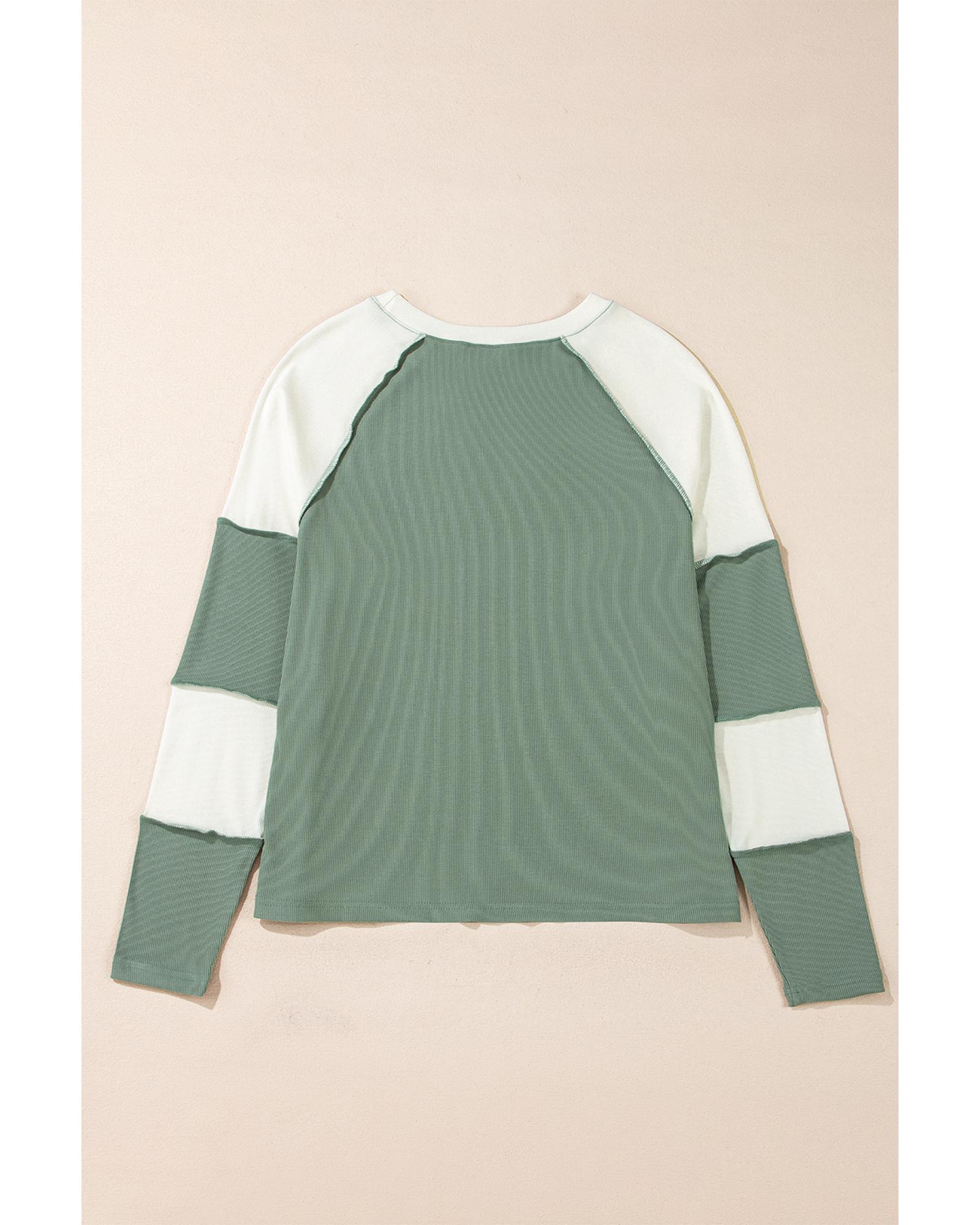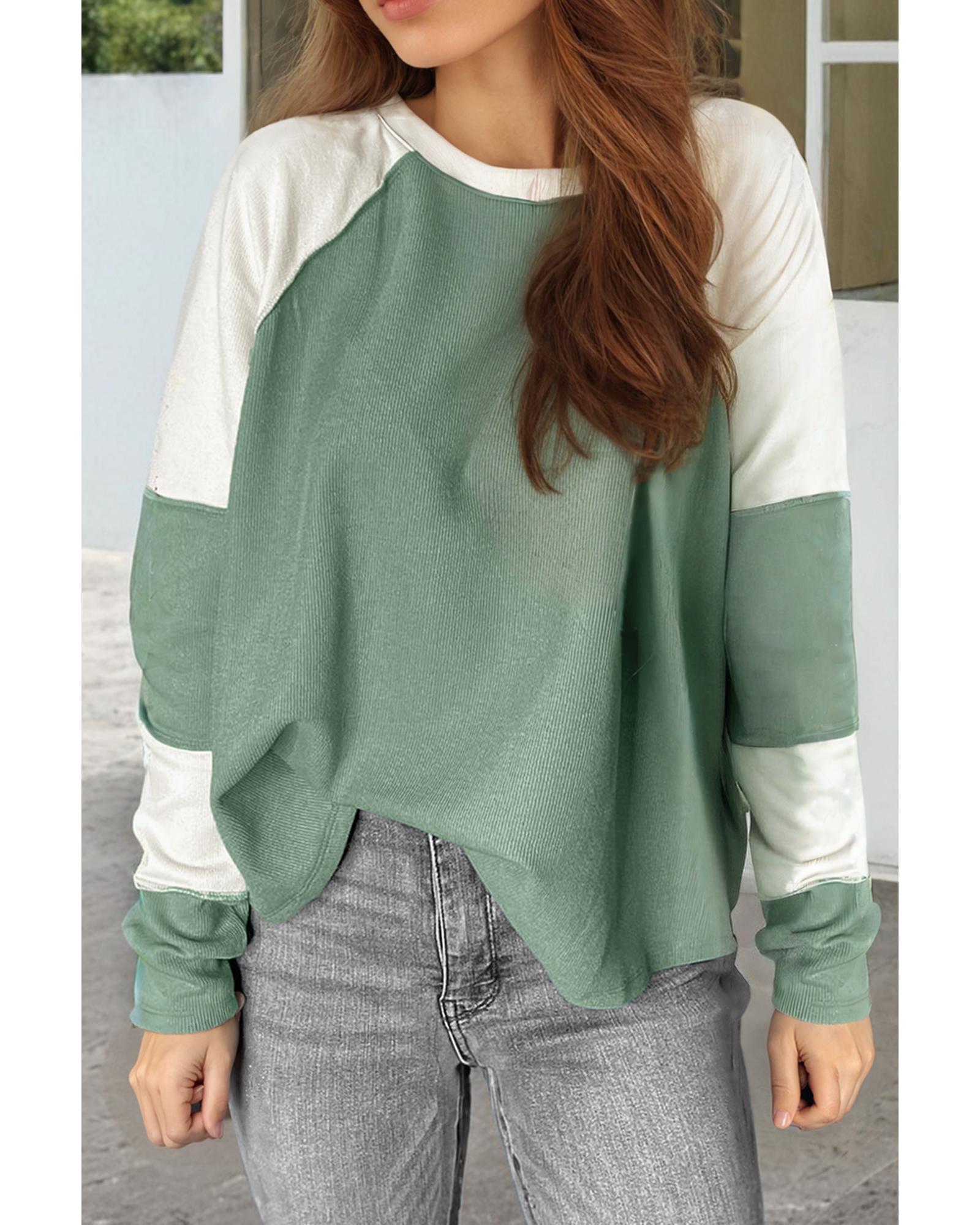 Mint Green Ribbed Colorblock Patchwork Raglan Long Sleeve Top – M