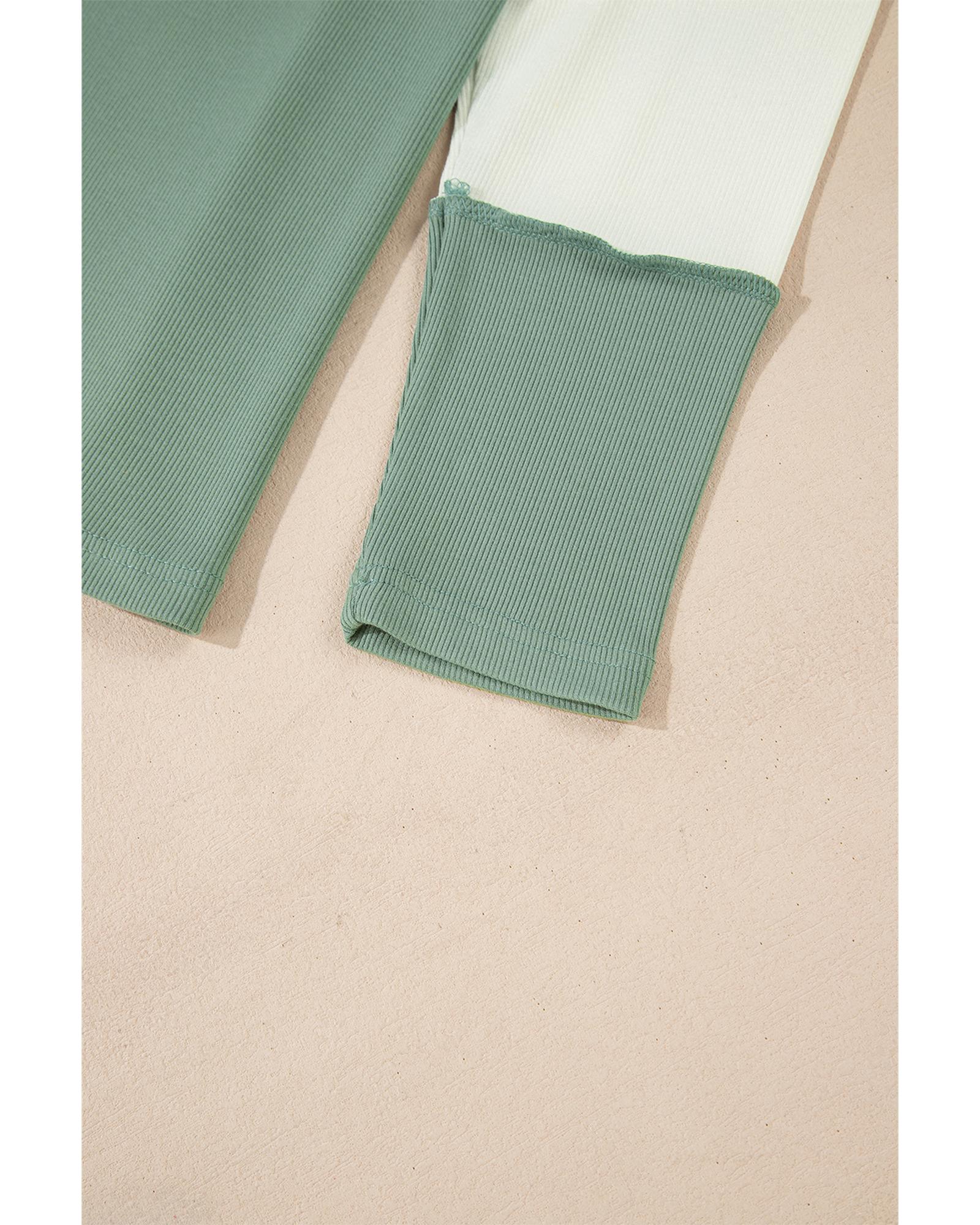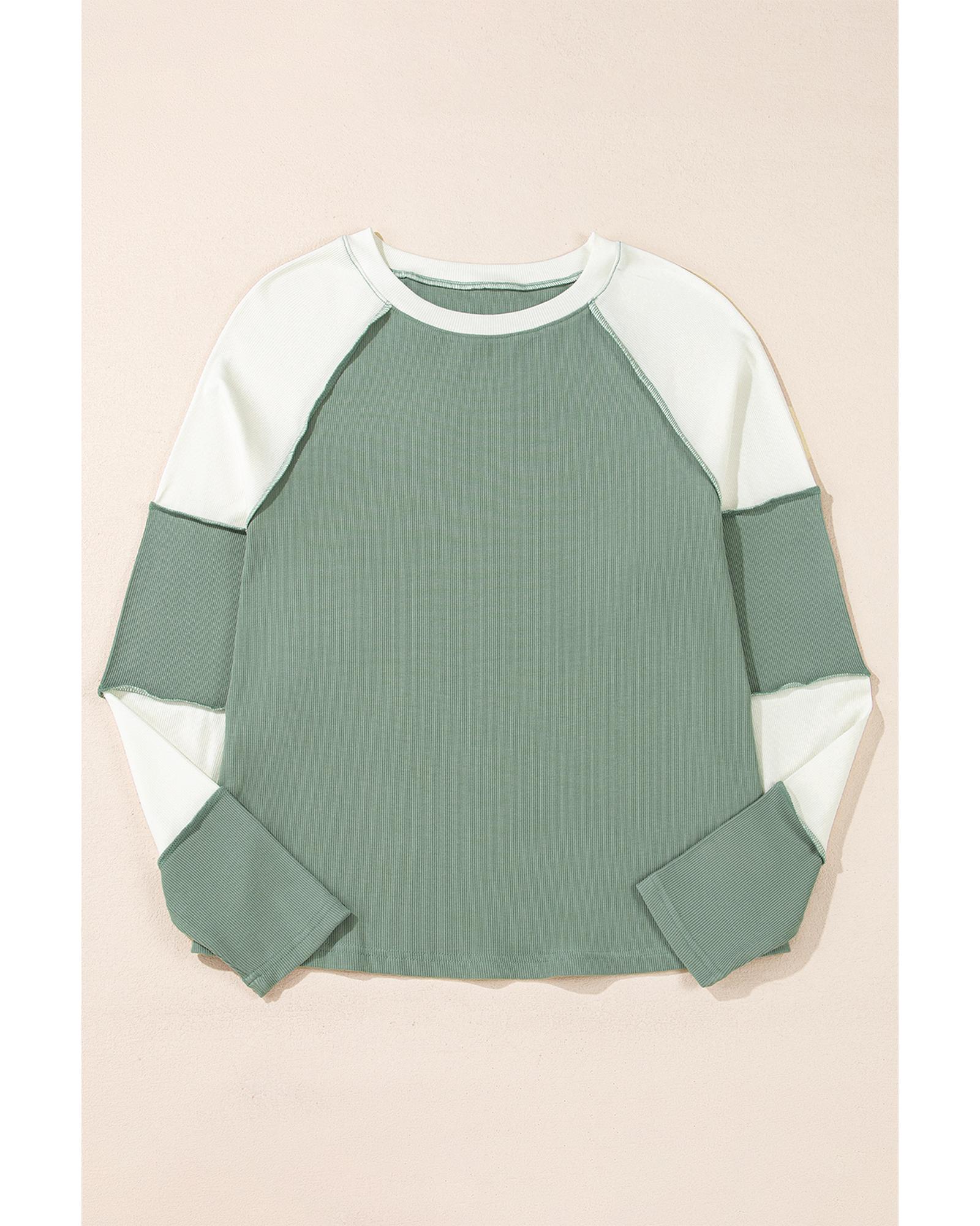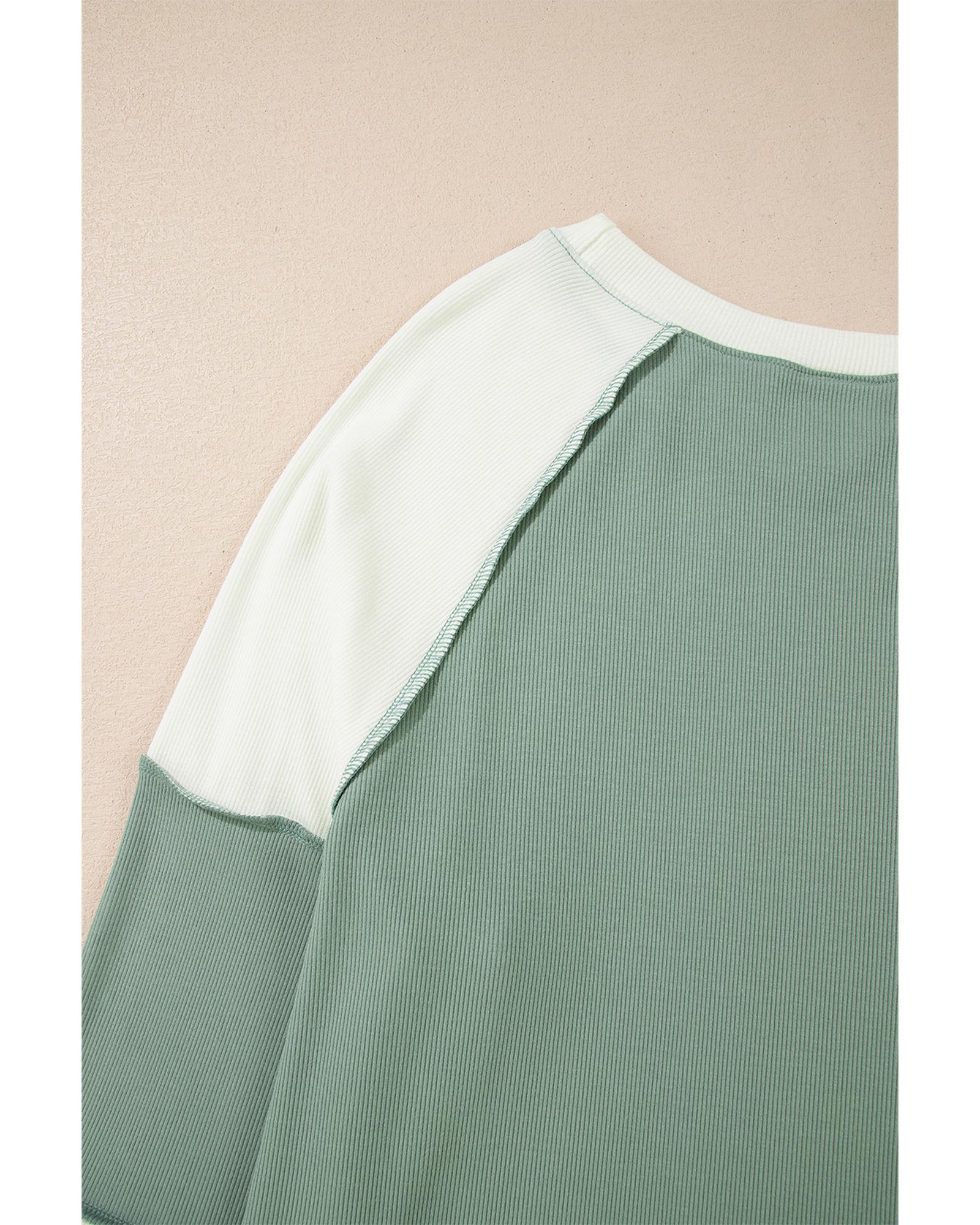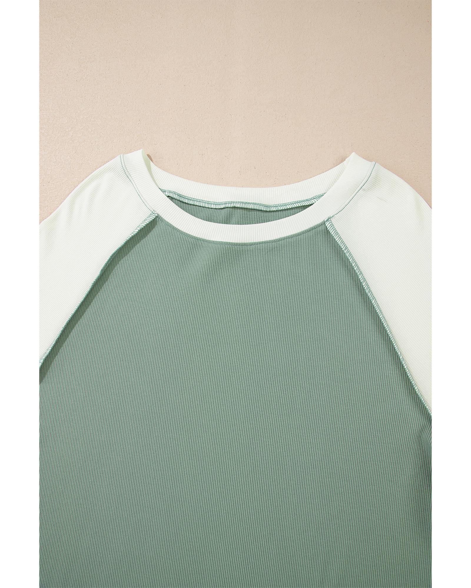 Mint Green Ribbed Colorblock Patchwork Raglan Long Sleeve Top – XL