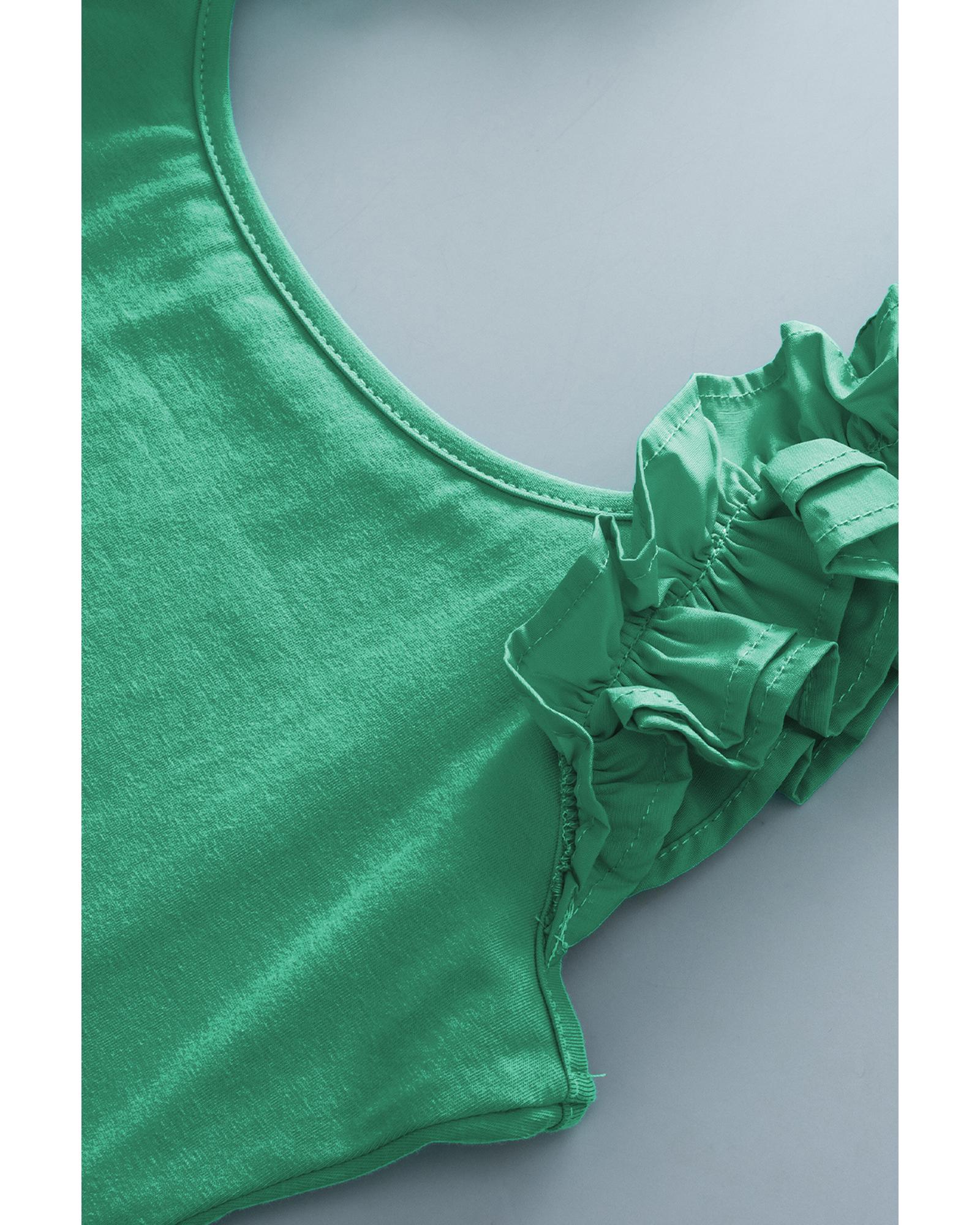 This slim tank top features a trendy fitted design with a soft, breathable fabric that offers high elasticity. Its stylish mint green color and ruffled wide straps make it a fashionable choice for casual wear. The sleeveless style with a low neckline provides a chic and comfortable fit, suitable for various occasions.