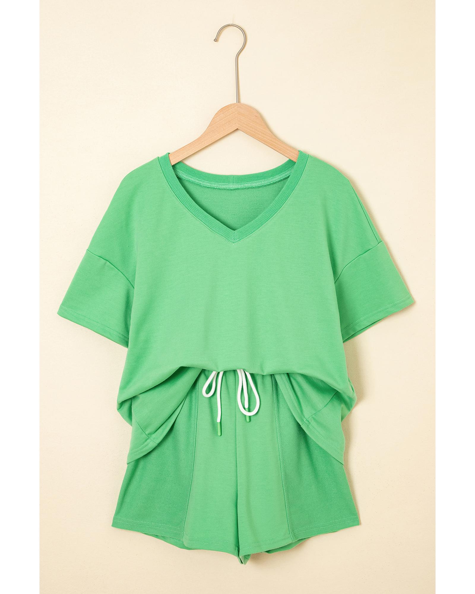 This stylish set features a mint green V-neck drop shoulder tee paired with patchwork drawstring shorts, offering a comfortable and trendy look. The design combines casual elegance with unique patchwork details, making it suitable for various casual occasions.