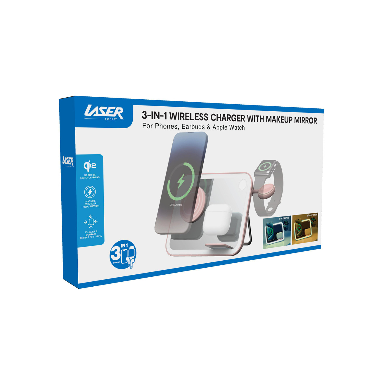 This is a versatile 3-in-1 wireless charger designed to simplify your daily routine by combining charging for your smartphone, earbuds, and smartwatch with a built-in makeup mirror featuring adjustable lighting modes. Its compact and foldable design makes it ideal for use at home or while traveling, ensuring your devices stay powered and your look stays flawless.